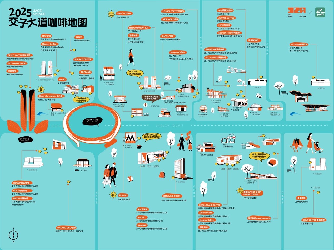 当天,《2025交子大道咖啡地图》首发,一图解锁交子大道的成都味道。此外,现场还设置了咖啡风味挑战、咖啡DIY、咖啡杯叠杯等多项互动体验环节,以及市集游园集章活动。