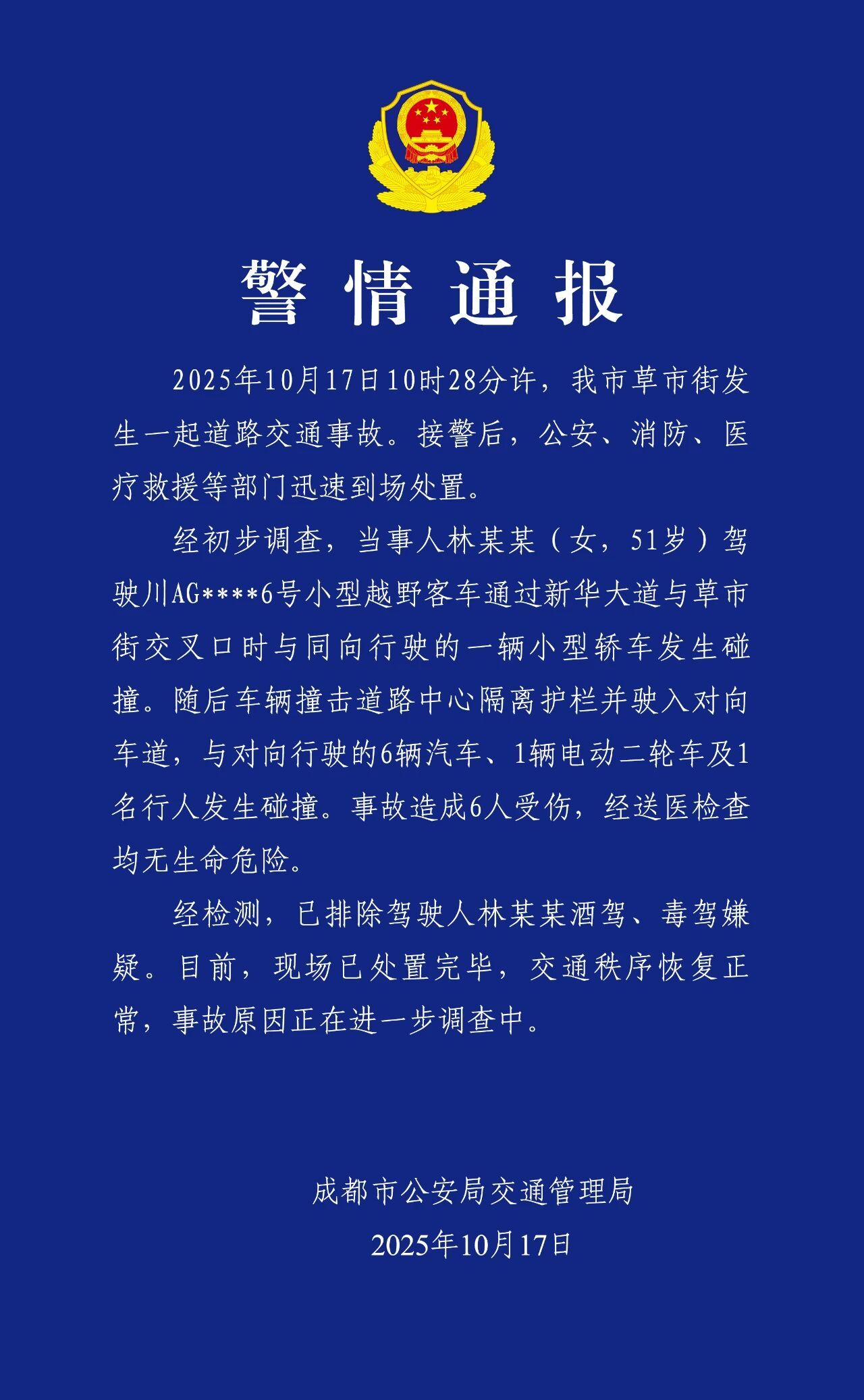 10月17日,成都市公安局交通管理局发布警情通报,当天上午,成都草市街发生一起交通事故,事故造成6人受伤,经送医检查均无生命危险。通报全文如下: