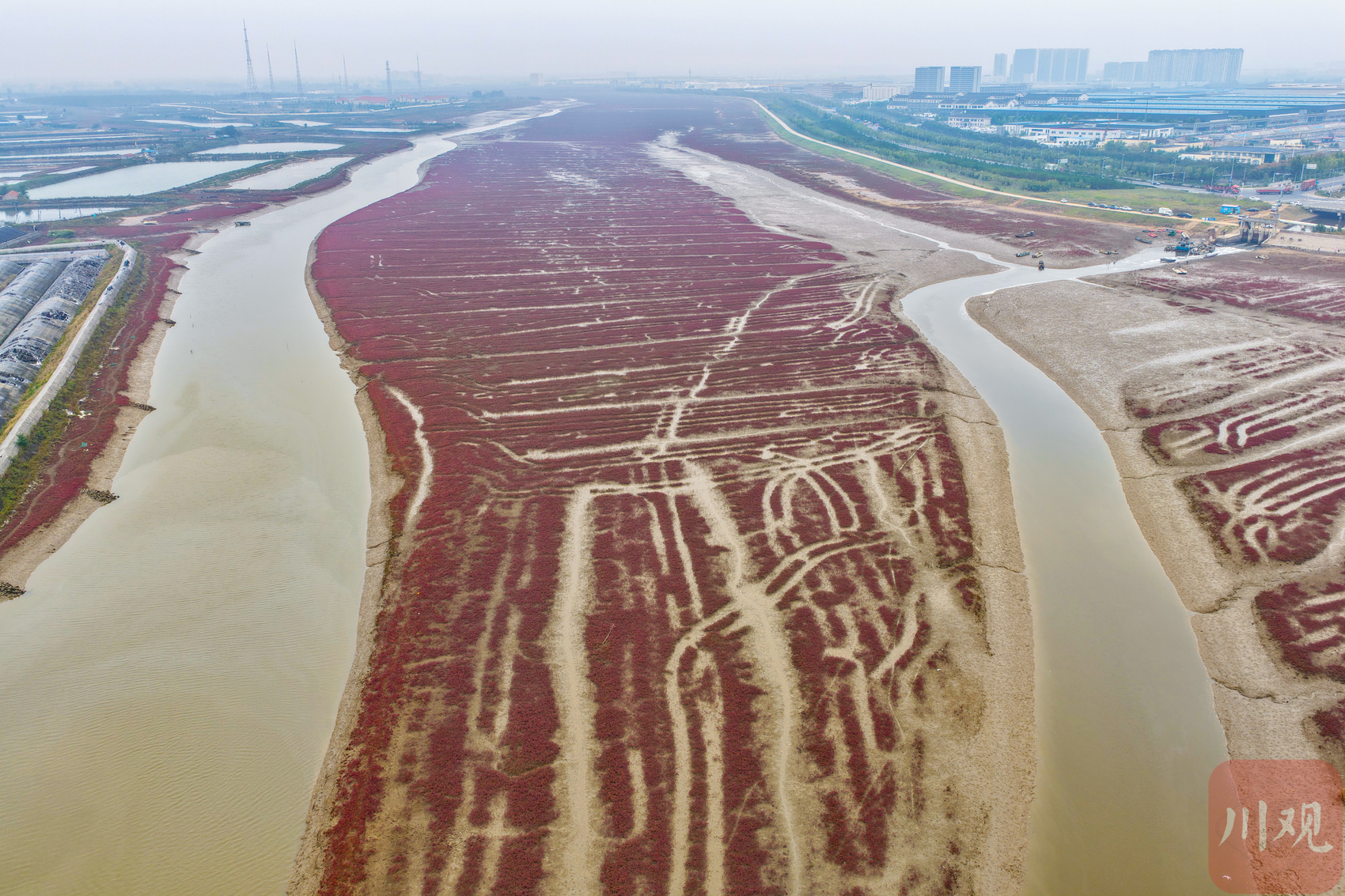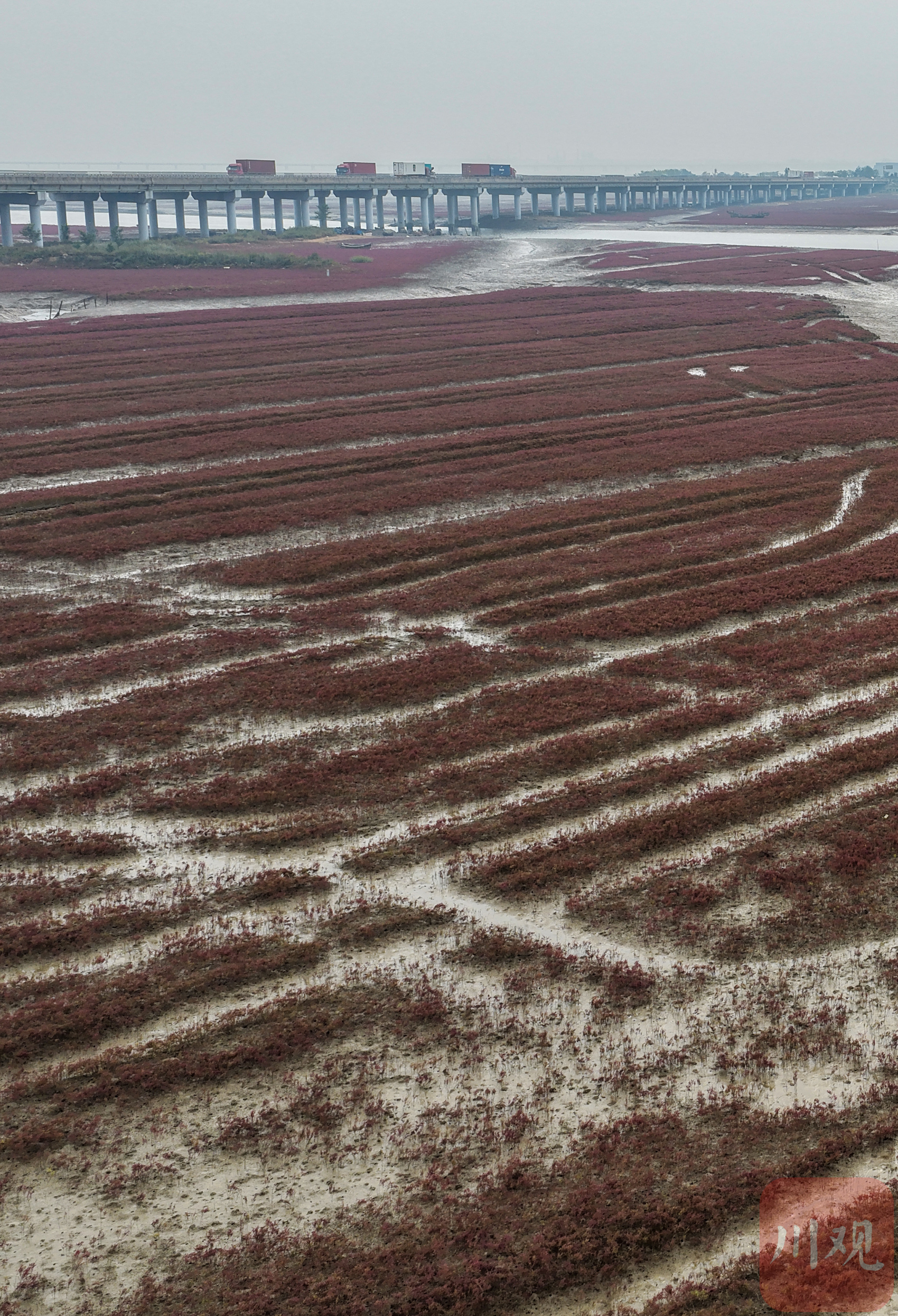 2025年10月17日,记者在位于山东青岛西海岸新区红石崖街道河海湿地看到,大面积的盐地碱蓬绽放出火红的色彩,仿佛一张红色的地毯绵延铺展。连日来,位于山东青岛西海岸新区红石崖街道河海湿地的盐地碱蓬织就的“红海滩”绚丽缤纷,迎来一年中最佳观赏期,美不胜收。