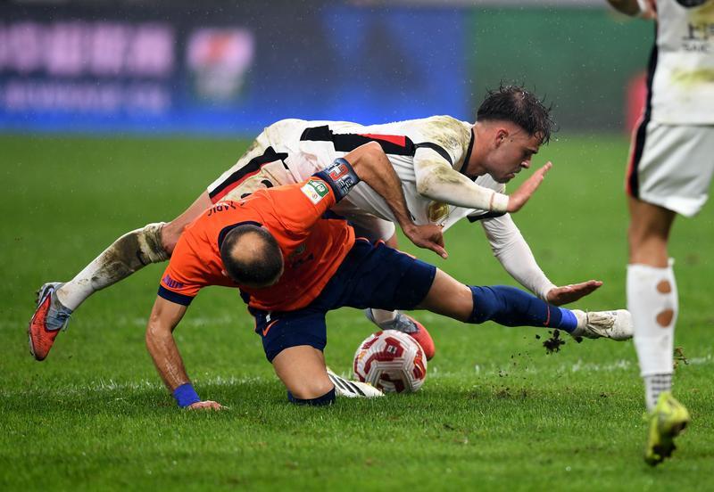 10月17日,上海海港队球员奥斯卡·梅伦多·希门尼斯(上)在比赛中与青岛海牛队球员萨里奇拼抢。
