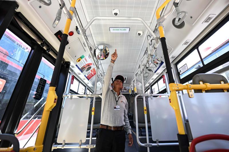 10月16日,在智利科皮亚波,一名司机介绍新启用的中国生产的新能源公交车。