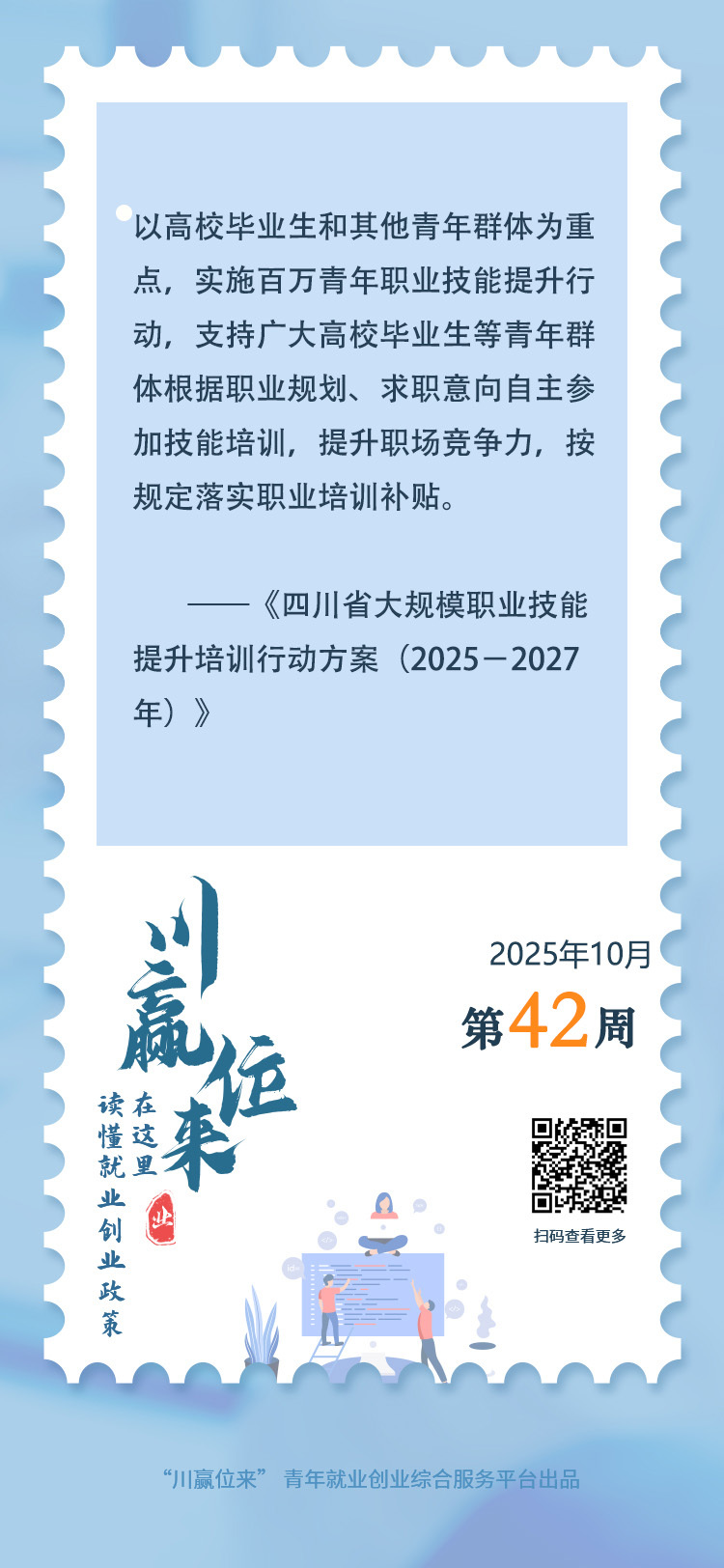 四川省人力资源和社会保障厅等部门近日联合印发的《四川省大规模职业技能提升培训行动方案(2025—2027年)》提出,以高校毕业生和其他青年群体为重点,实施百万青年职业技能提升行动,支持广大高校毕业生等青年群体根据职业规划、求职意向自主参加技能培训,提升职场竞争力,按规定落实职业培训补贴。