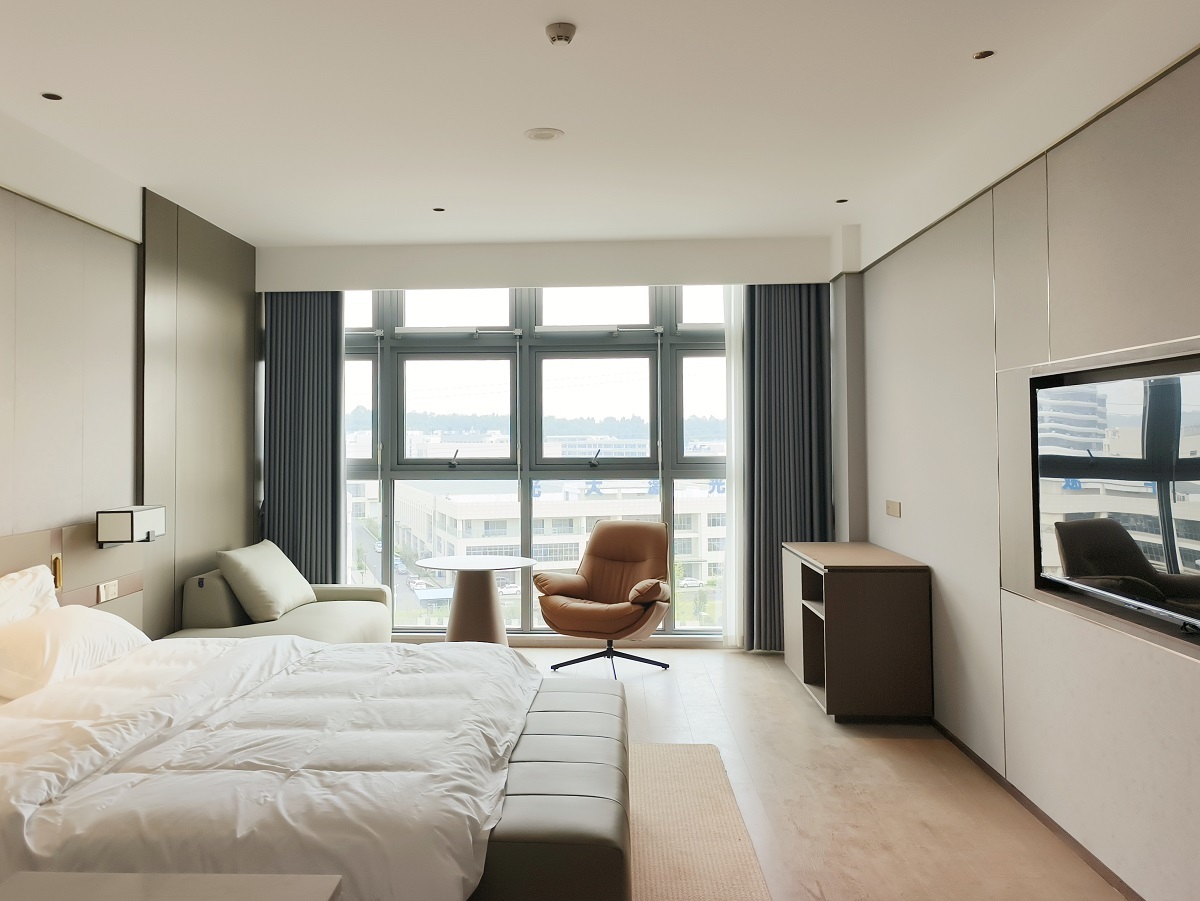 据介绍,游仙区保障性租赁住房项目位于石马镇东林社区,总投资6900万元,总改造建筑面积约4万平方米,共200间房源,包含单间、双人间、四人间、六人间等房型,所有住房均实行分标准、分档次的全屋装修,并配备部分家电和家具,兼顾舒适与性价比。此外项目还规划建设了餐厅、会客厅、会议室等公共空间,真正达到“拎包入住”的效果。