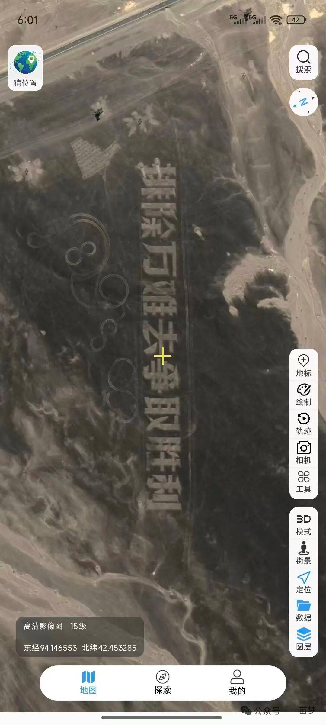 选择在此地建造标语,也经过了周密考量。哈密戈壁地势平坦开阔,风力作用相对稳定,减少了标语被流沙掩埋的可能。同时,当地降雨稀少,碱土地面坚硬不易被冲刷,为标语的长期保存提供了理想条件。五组标语共计包含30个汉字加上一个巨大的感叹号,总面积达到75000平方米。