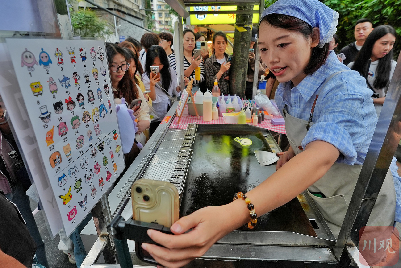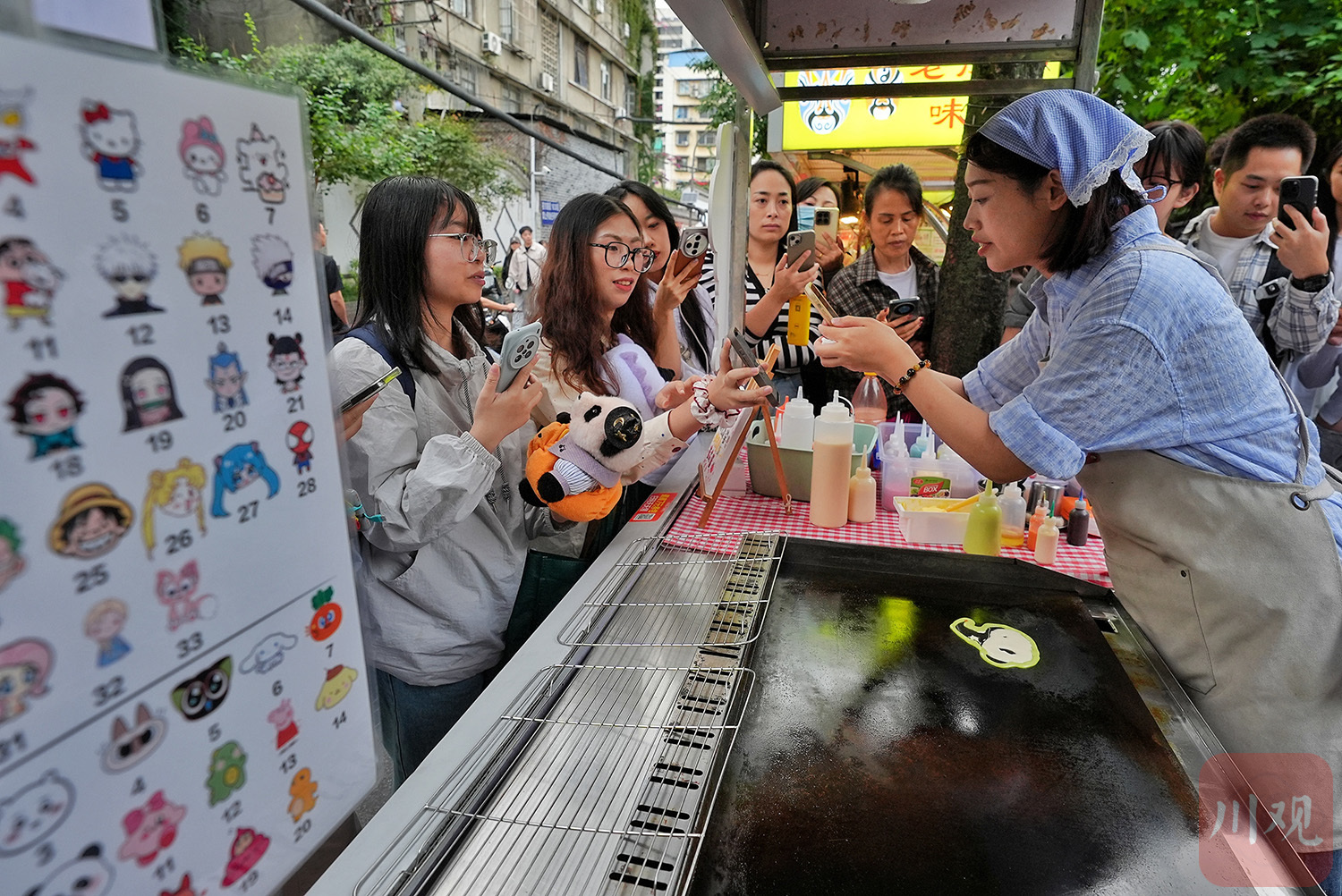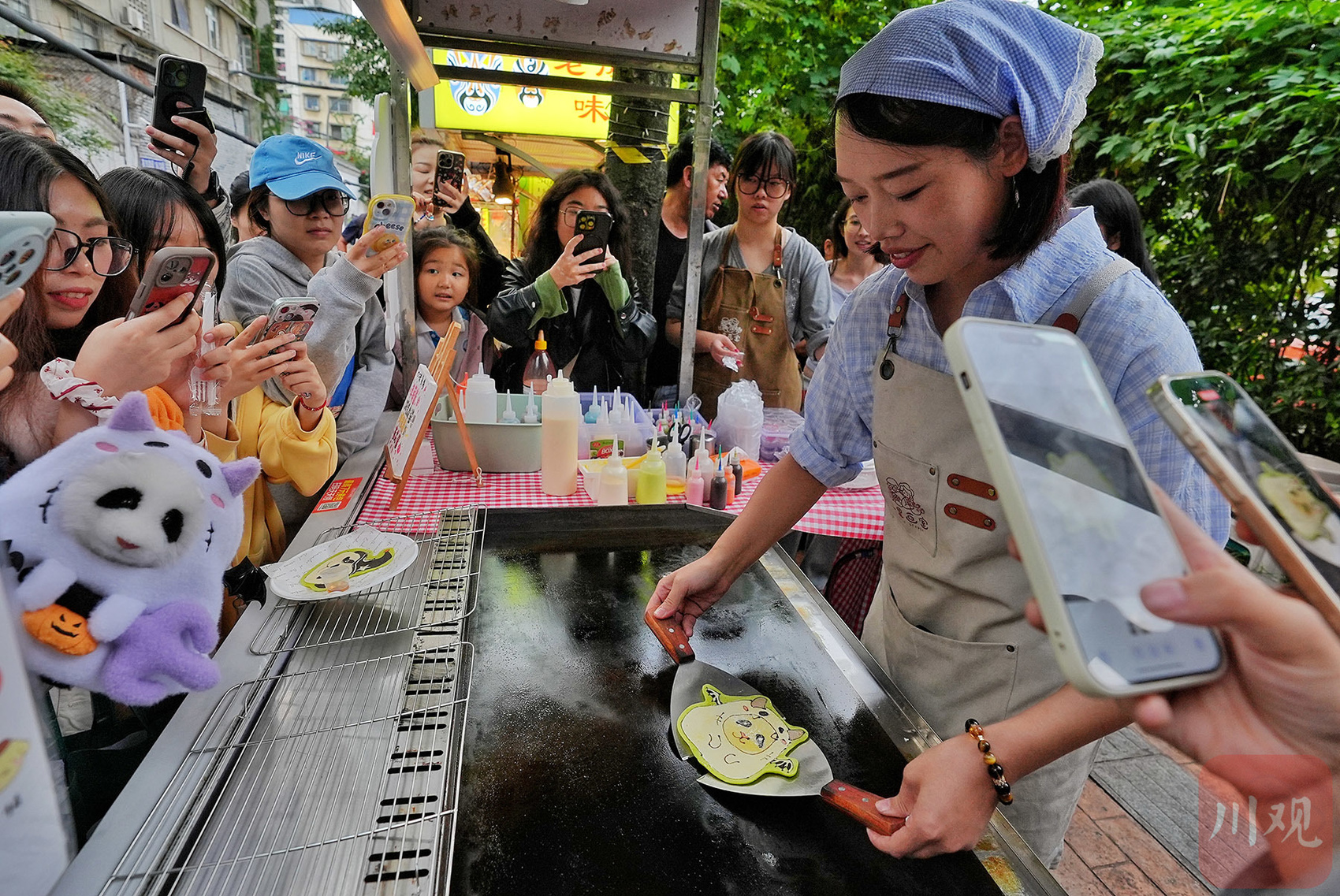 排队人群中,既有本地市民,也有专程前来打卡的外地游客。“就是一般煎饼,买的就是心头好。”一位刚拿到“大熊猫花花”图案煎饼的游客笑着说。据悉,摊主曾女士曾是一名美术老师,两个月前她将艺术与美食结合开始创业。如今,她的摊位已成为夜市最具人气的景观之一,每晚限量60份,线上排号往往在1小时内就全部约满。这枚藏在烟火巷弄里的“创意煎饼”,已成为夜市经济中一道新颖别致的风景线。