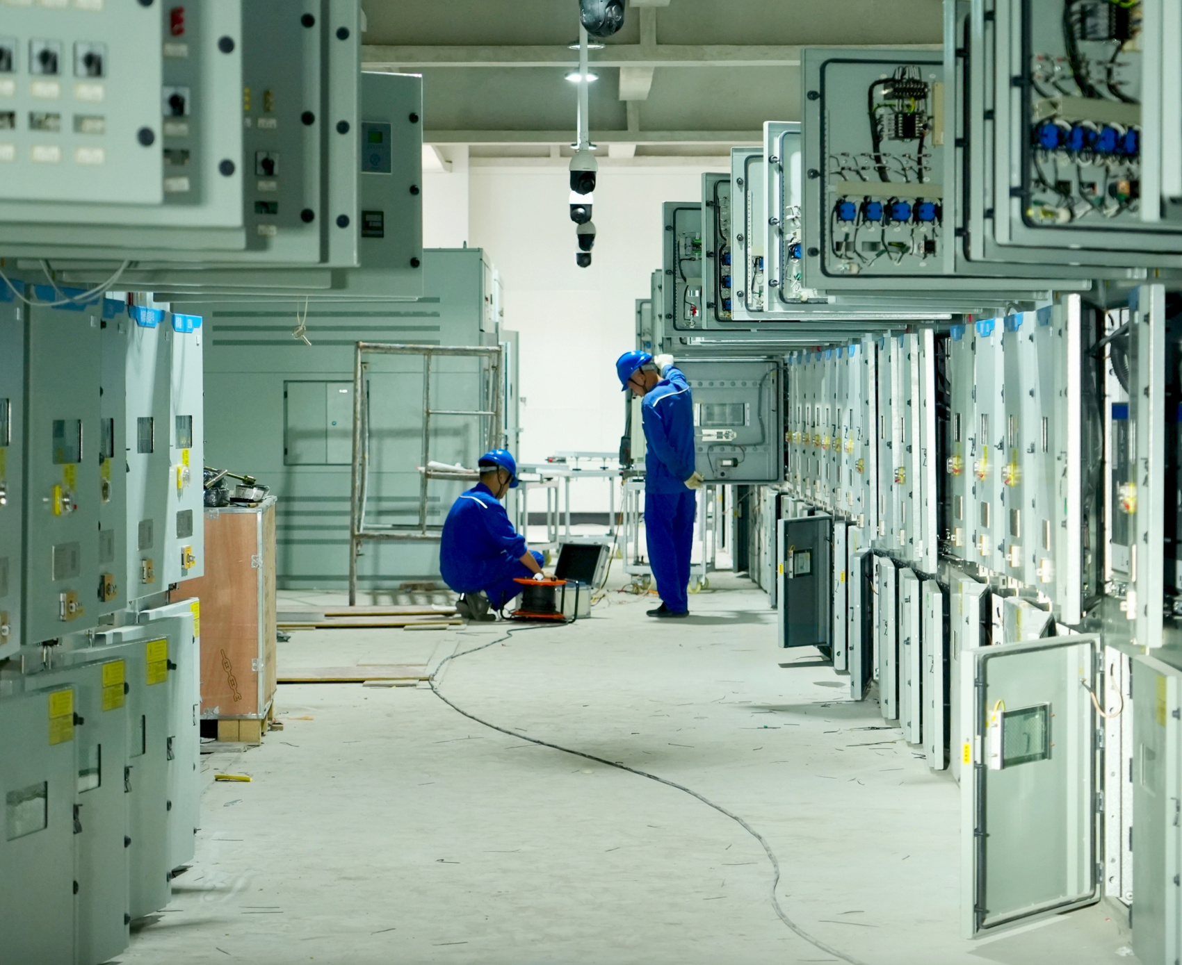 在110千伏配电装置楼内部,这里也是一片忙碌地调试场景。内江星原电力集团有限责任公司工作人员正在调试变电站的电气设备,电气设备调试团队工作人员手持专业检测仪器,正逐一对室内的10千伏高压开关柜开展交接实验。