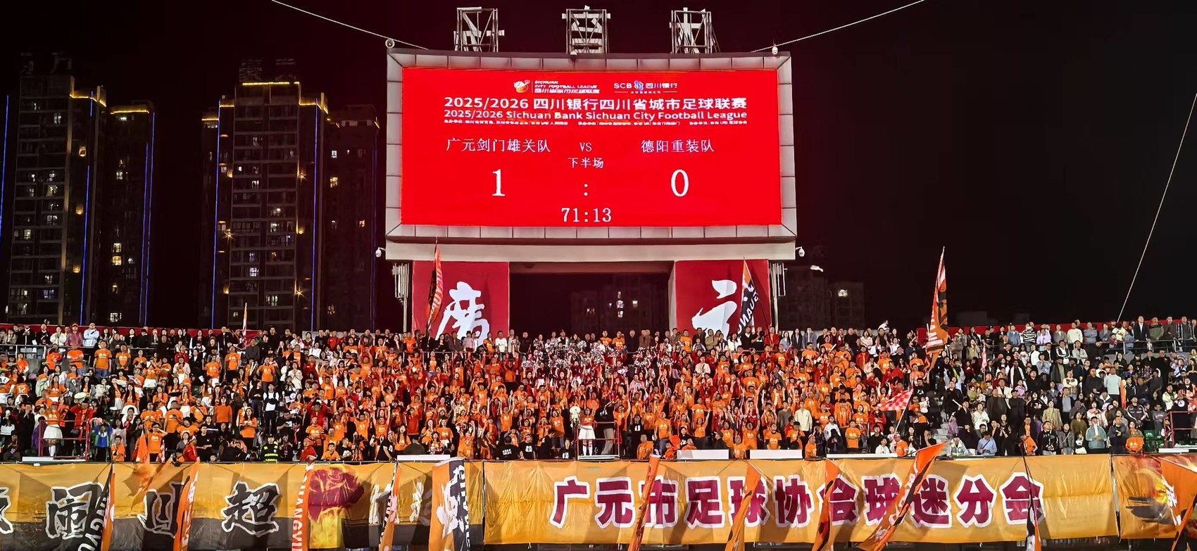 10月18日晚,2025/2026川超联赛川北赛区第五轮焦点战在广元主场落幕,广元剑门雄关队1:0击败德阳重装队。赛场之上竞技激烈,赛场之中光影传情。上半场结束后,600余架无人机以体育场夜空为幕布,上演两地跨城“空中对话”,让“体育搭台、文旅唱戏”理念鲜活落地。