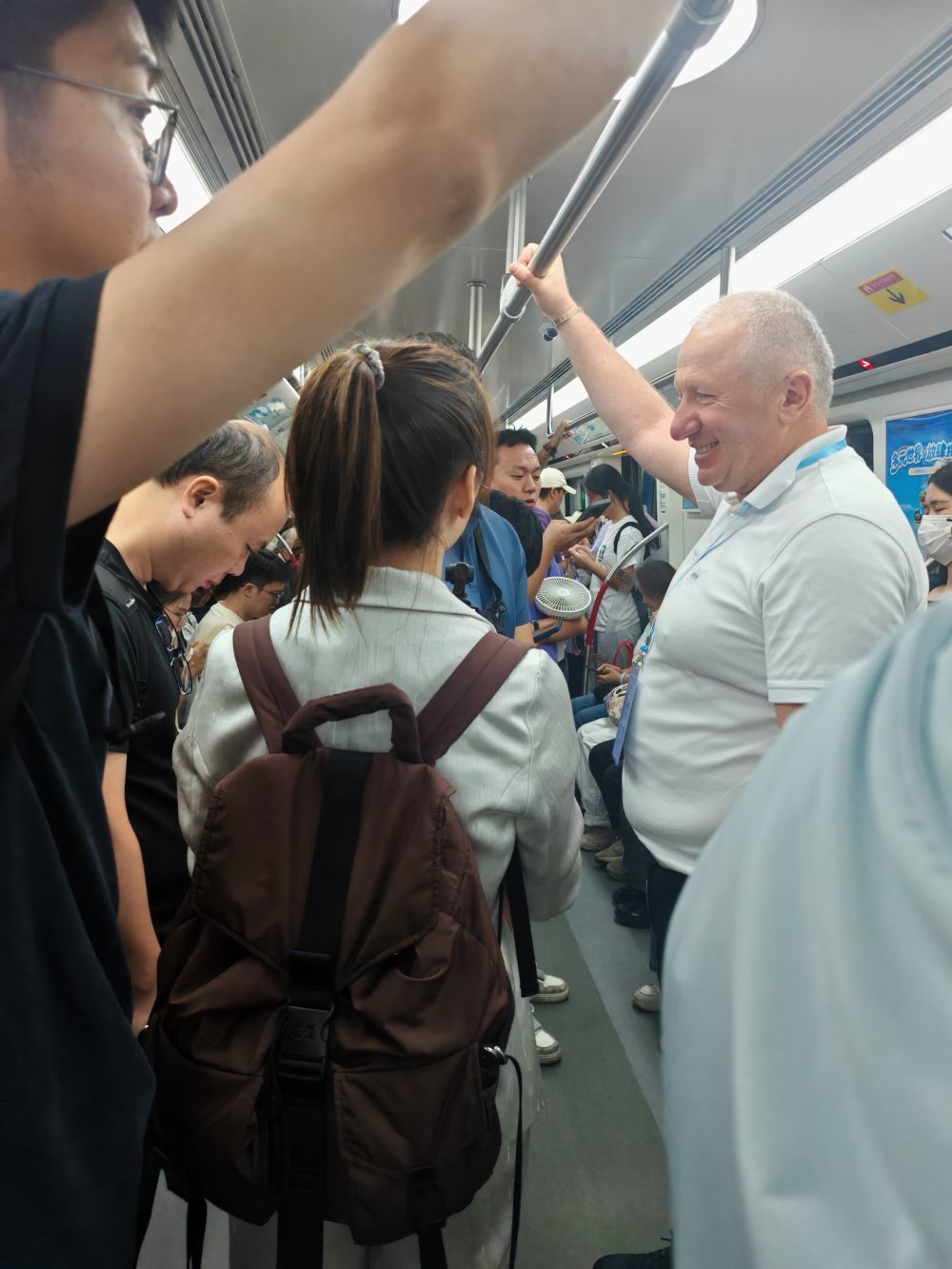 10月16日9时不到,车厢里挤满了人。与往日不同的是,来自不同地区和国家的人汇聚在高速行驶的地铁列车上,彼此交流中夹杂着不同的语言和多样的手势。
