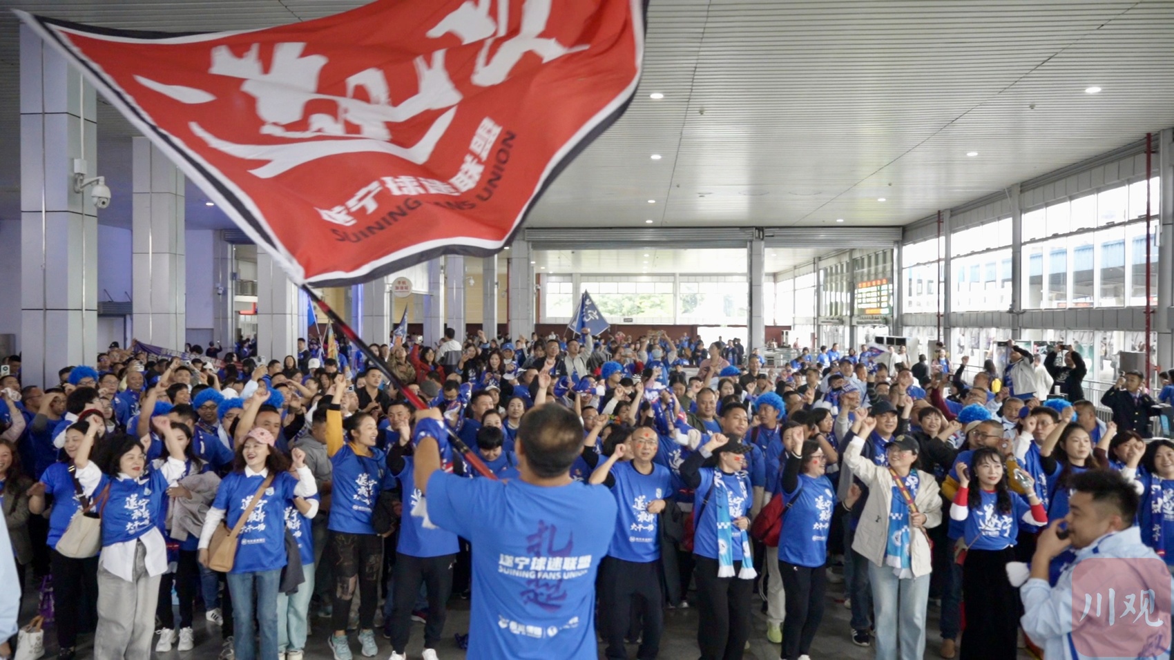 “遂宁,雄起!”10月19日中午,遂宁火车站喊声阵阵,1100余名球迷整队集合,有序搭乘球迷专列前往达州,为遂宁队加油助威。
