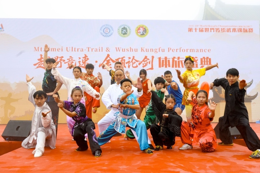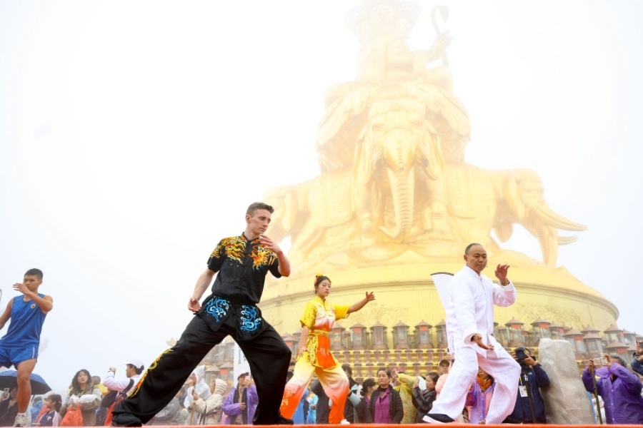 10月19日,云雾缭绕的峨眉山金顶,中外武者的身影在空中划出优美弧线。当天,“越野竞速·金顶论剑”体旅盛典在这里举行。14位来自多个国家和地区的武林高手们从拳术、器械两大类别,展示了鹰爪拳、螳螂拳、太极拳、峨眉刺、峨眉枪、南棍等十多种传统武术项目,在云雾间切磋技艺。