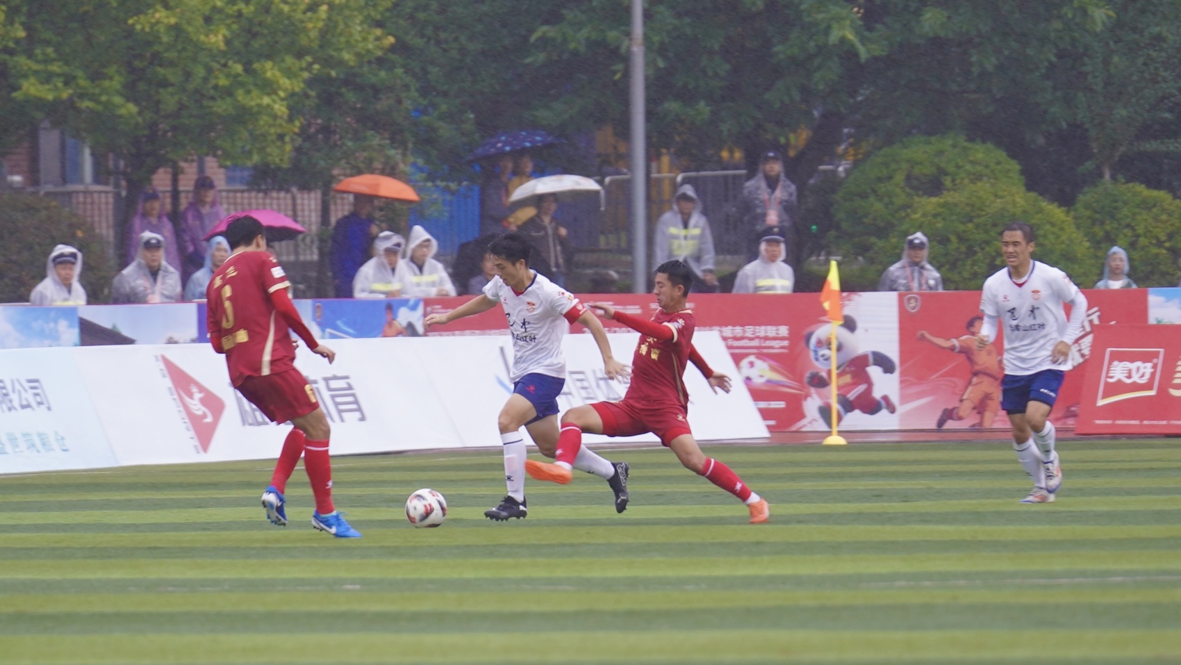 两队球员在雨中拼抢。(胡力文 摄)