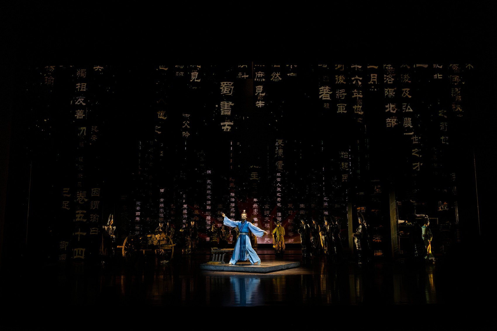 该剧通过细腻的舞台布景、精致的服饰以及舞者们的精湛演技,将三国时期的忠、勇、智、义与文人风骨等历史元素一一呈现,既保留了传统美学的含蓄与内敛,又赋予了其新的生命力和时代感。同时,在传统美学基础上,《陈寿·三国志》巧妙地运用了现代舞台技术实现光影交错等效果,使得整个舞台效果更加立体、生动。