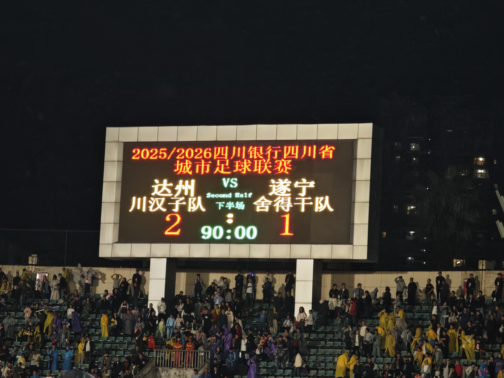 随着主裁判一声哨响,10月19日晚川超联赛达州川汉子队与遂宁舍得干队的比赛进入尾声,最终双方比分锁定至2:1。
