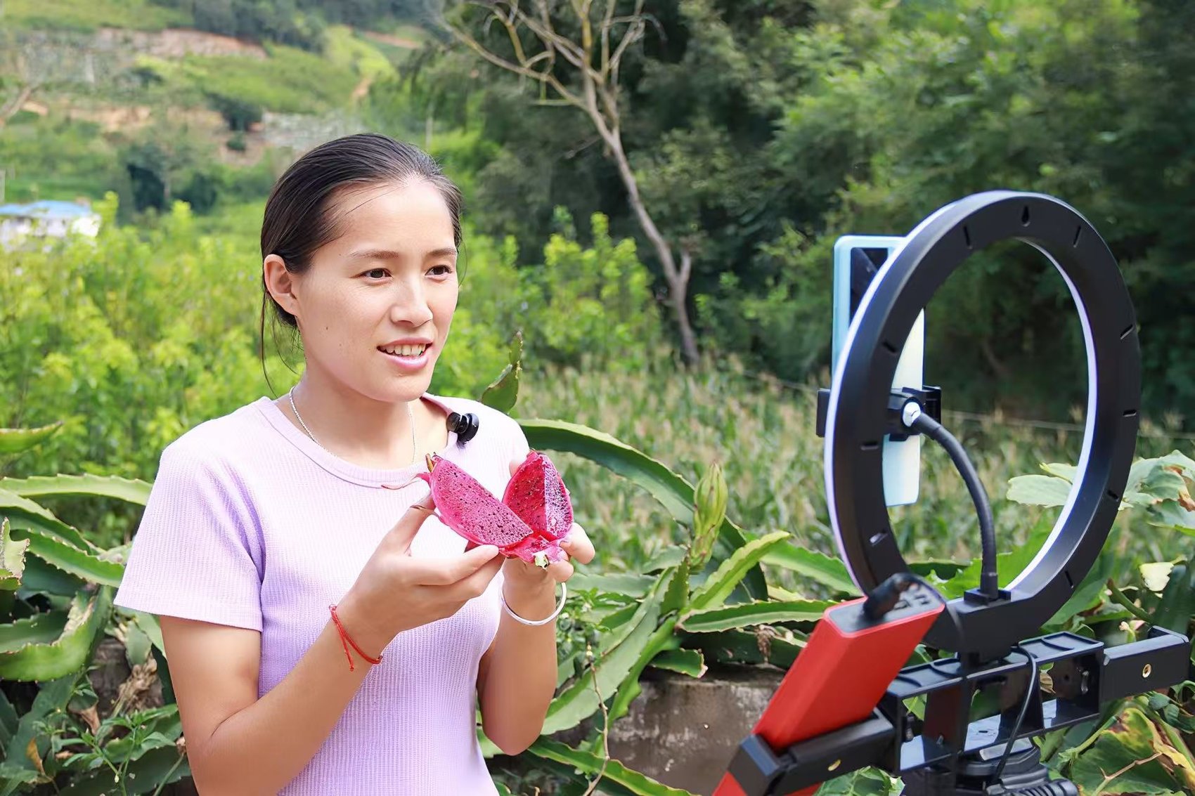 AI培训师、村民王明珍通过直播带货,将火龙果卖到全国各地