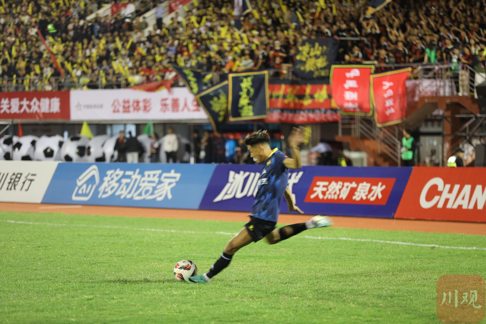 绿茵场上,运动员奋力拼搏,精彩不断。看台上,两地球迷为赛事呐喊助威,热情不减。而赛场外的体育场集市,展台展出的两地农特产品,更是让“川超”成为推好物、促消费的重要平台。