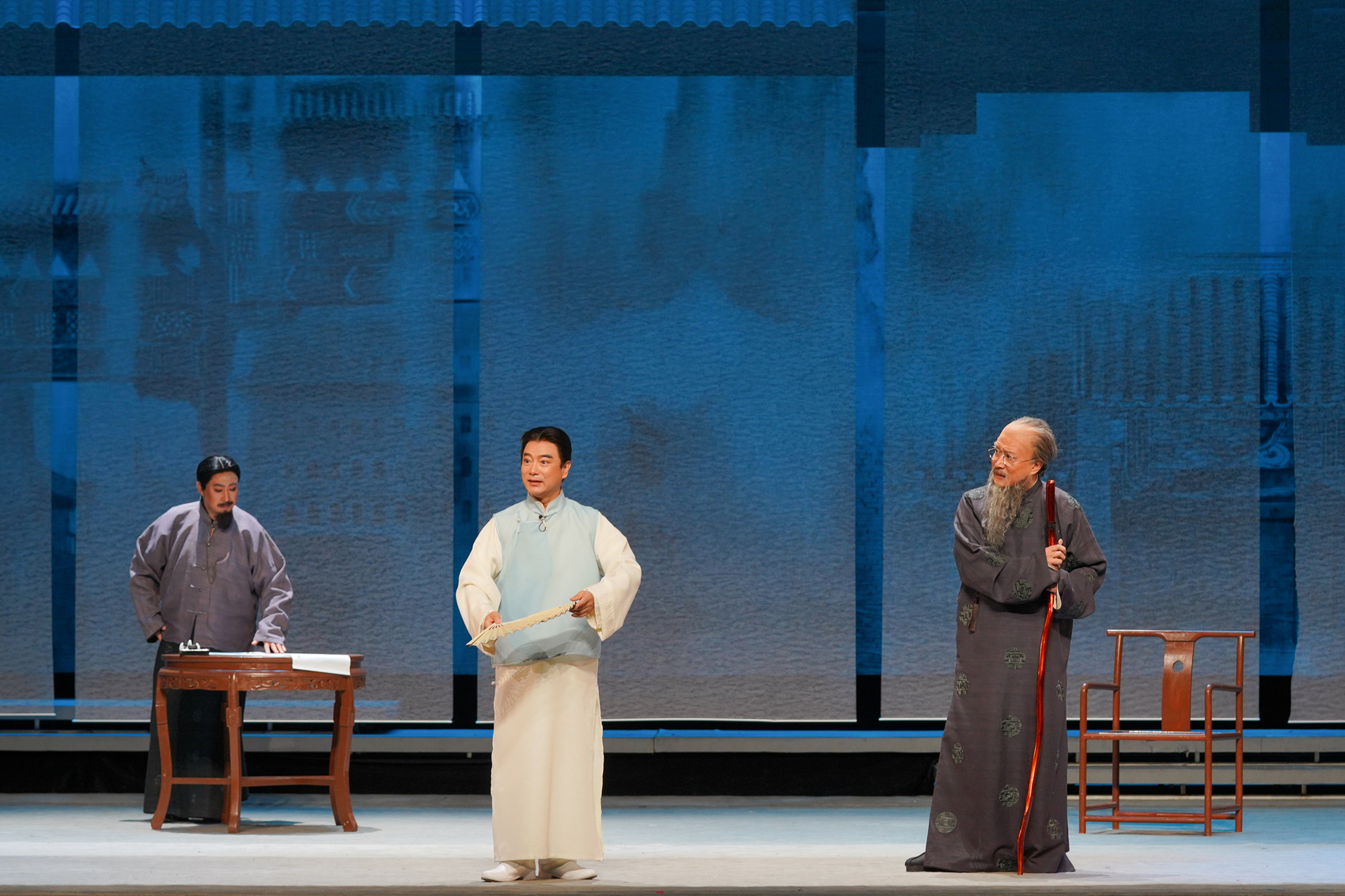 剧中重点描绘了齐白石在“衰年变法”中的心路转变,创造性地设置了“神思”与“尘想”两个虚拟角色,充分展现了人物内心挣扎与艺术蝶变。舞台设计匠心独运,摒弃了繁琐的装置堆砌,巧妙运用21道类宣纸幕,使市井、厅堂、心理等多重时空变幻自如。灯光、投影的溢彩生辉,形成了浪漫主义色彩的舞台风格。音乐设计上融入北京民歌、京韵大鼓、湖南山歌,颇具特色。