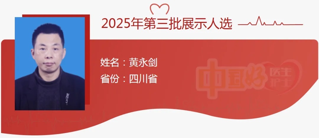 黄永剑,汉族,1981年9月生,中共党员,四川省自贡市贡井区桥头镇增产村卫生室村医、执业助理医师。1991年,黄永剑因病导致肢体三级残疾。24年来,他跛着脚出诊3100多次,救治患者近8.2万人次。2020年被中共四川省委、四川省人民政府授予“四川省抗击新冠疫情先进个人”称号。2024年被四川省委宣传部、四川省精神文明建设办公室、四川省卫生健康委员会评为第五届“健康四川—大美医者”。