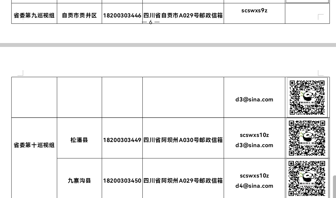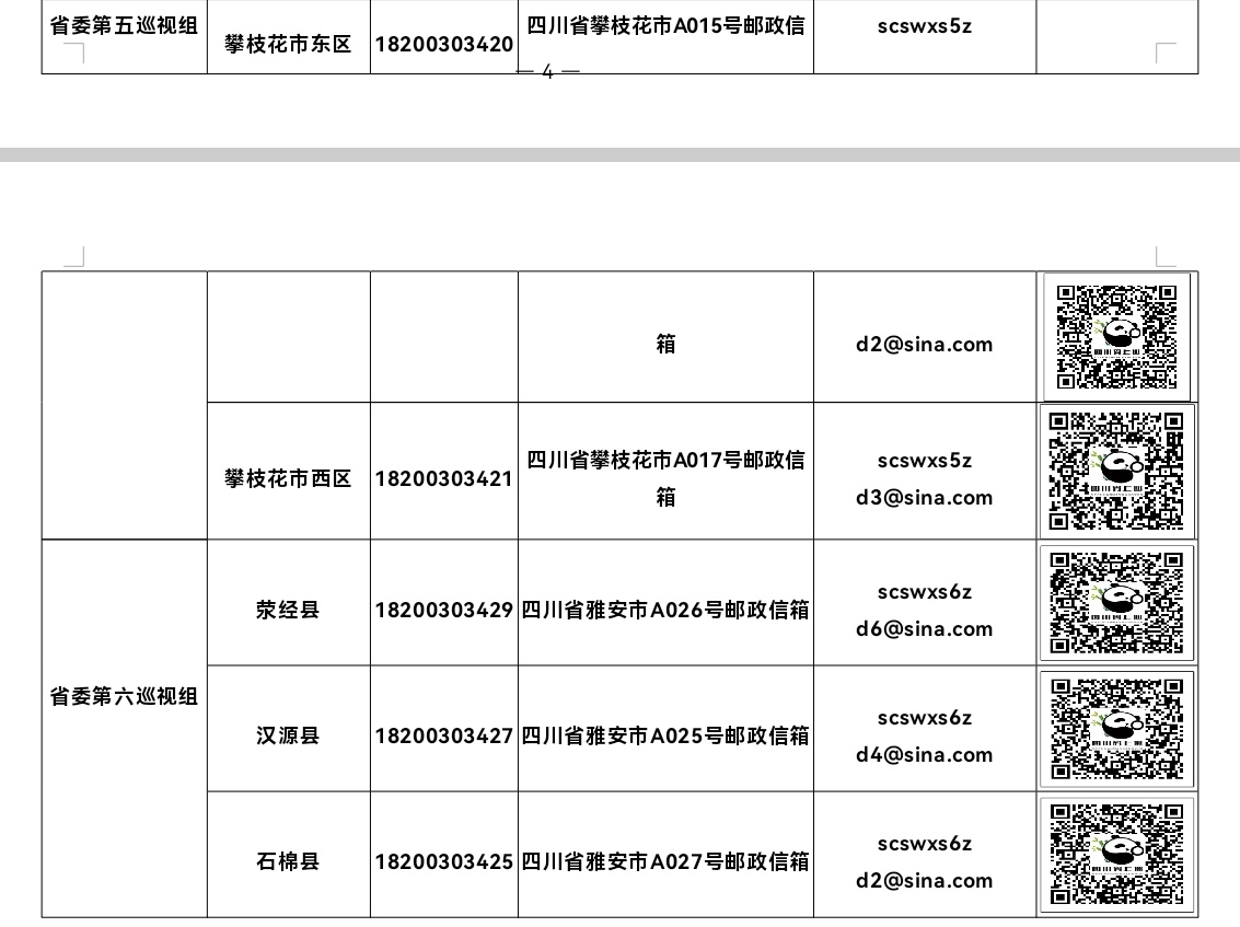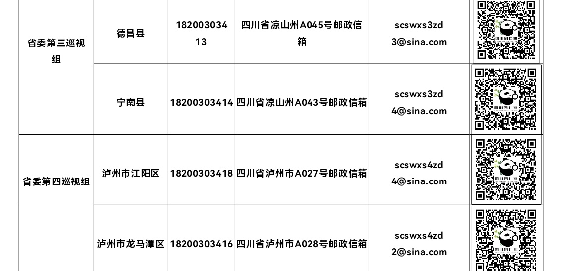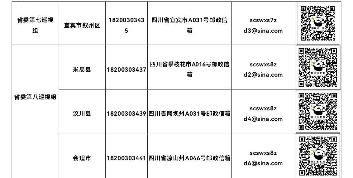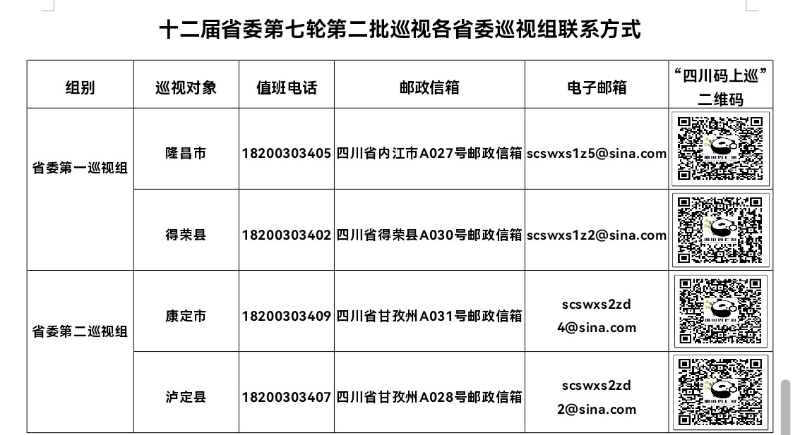巡视期间,各省委巡视组设置了值班电话、邮政信箱、电子邮箱和“四川码上巡”二维码。省委巡视组主要受理反映被巡视党组织领导班子及其成员和下一级党组织领导班子主要负责人,以及重点岗位人员问题的来信、来电、来访,重点是关于违反政治纪律、组织纪律、廉洁纪律、群众纪律、工作纪律和生活纪律以及巡视整改等方面的问题反映。对其他不属于巡视受理范围的信访问题,将按规定由被巡视地区和有关部门认真处理。