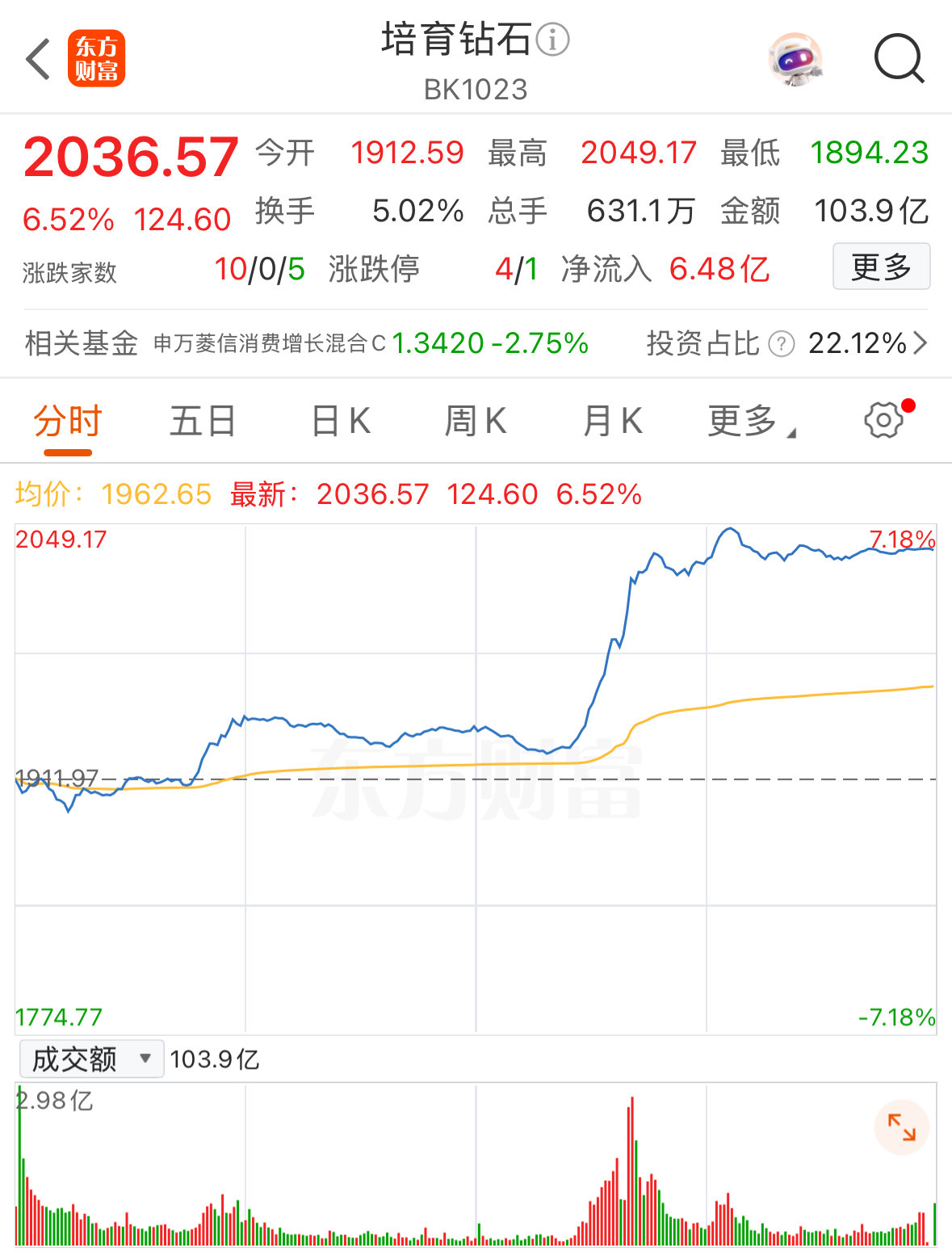 今日午后,培育钻石概念突然大幅拉升。四方达在13:25左右直线拉升,在15分钟内由涨幅不到4%,迅速拉升至“20cm”涨停板。力量钻石盘中涨幅超19%,惠丰钻石在今日收盘前20分钟实现“30cm”涨停。午后上涨的还有黄河旋风、中兵红箭、楚江新材等股票。消息面上,力量钻石官微宣布公司通过高温高压法成功培育全球最大的人工培育钻石单晶,这一技术突破对于培育钻石在半导体散热领域的应用具有重要意义,引发了市场对相关行业企业的关注与投资。