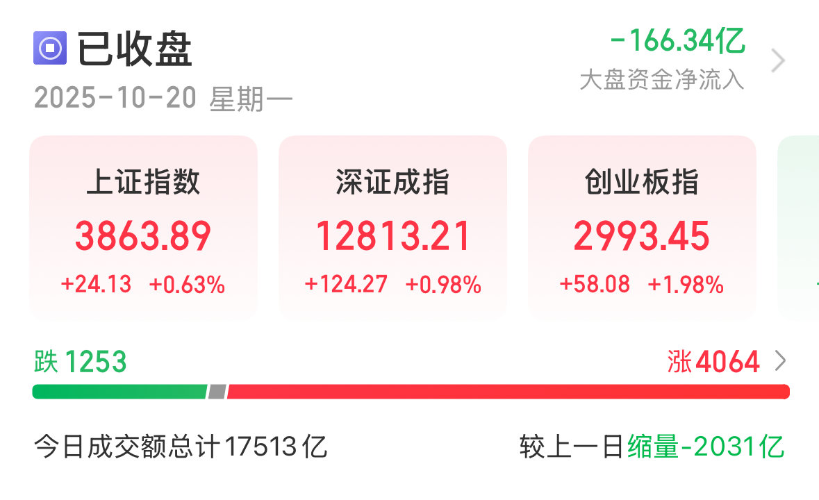 10月20日,A股三大指数集体上涨。截至收盘,上证指数涨0.63%,收报3863.89点;深成指涨0.98%,收报12813.21点;创业板指涨1.98%,收报2993.45点。全市场全天成交额17513亿元,较上日缩量2031亿元。全市场超4000只个股上涨。