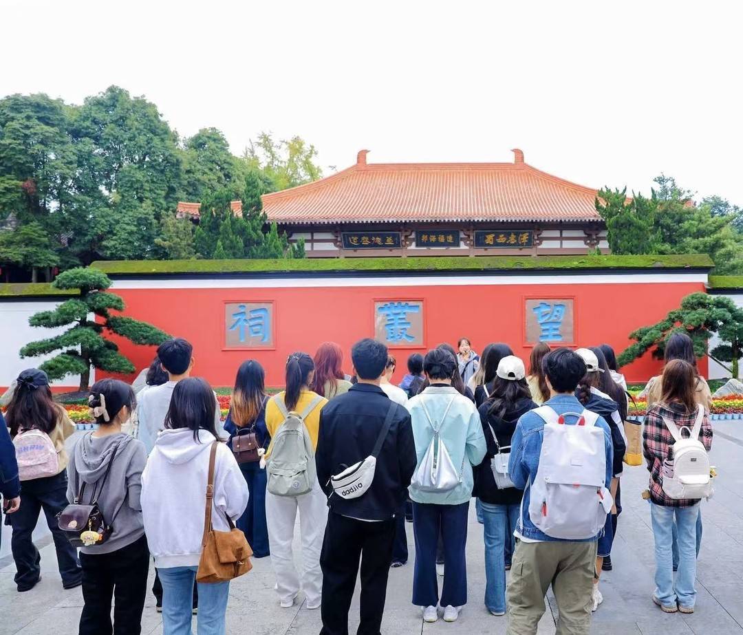 本次活动围绕“古蜀文化、蜀绣非遗、影视创意、科幻未来”四大版块进行线路设计。走进望丛祠,学子们沿着古蜀文明历史脉络,探寻杜鹃啼血、教民农桑的历史传说,而这份千年文化积淀,正成为郫都古蜀文化产业发展的核心引擎。在郫县豆瓣中国非遗文化体验园,学子们深入了解郫县豆瓣的文化传承与生产流程,跟着国家级非遗传承人学习“翻、晒、露”古法工艺体验。来到佛罗伦萨小镇,大家游览意大利风情特色商业街,感受国际时尚与本地消费融合的商业文旅场景。最后来到成都科幻馆,观看科技展,感受郫都科技创新与产业活力。中午,学子们还跟着红星饭店厨师长学习如何炒正宗的回锅肉,可谓“体验感拉满”。乘车途中,工作人员开展“郫都青年政策微课堂”宣讲,讲解“青年实干家”和人才驿站等政策,为青年送上成长“大礼包”。