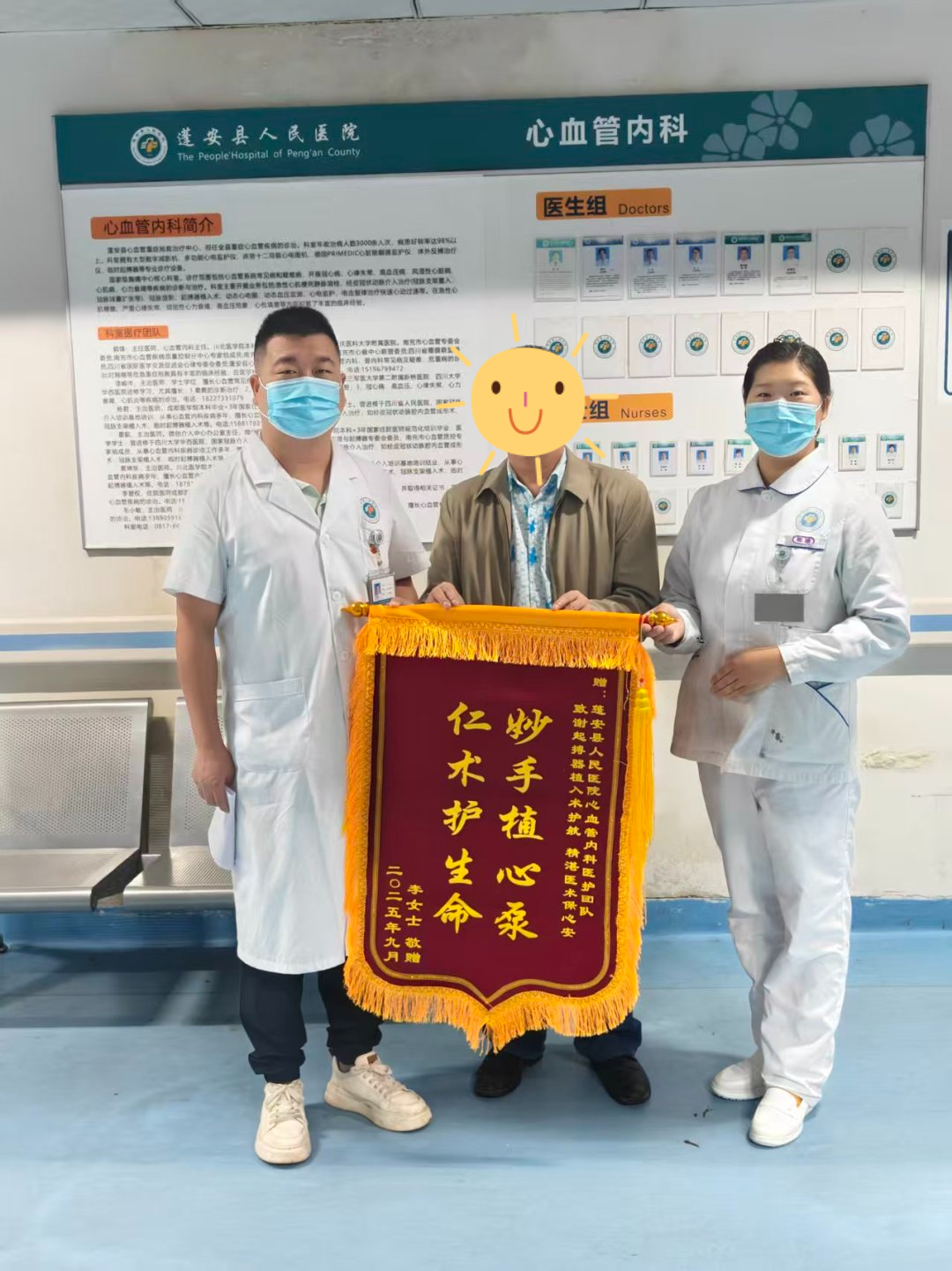 出院时,李女士与家属专程将绣有"妙手植心泵,仁术护生命"的锦旗送至医护团队手中,对科室主任领衔的医疗组及护理团队的精湛技术、人性化服务表达谢意。