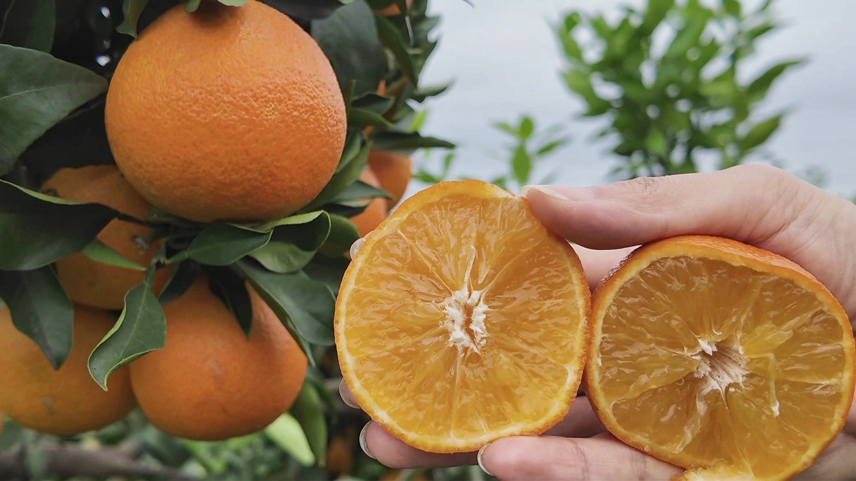 记者走进柑橘园,浓郁果香扑面而来,沉甸甸的果实压弯枝头,现场切开一颗成熟的爱媛果冻橙,果肉橙黄透亮,汁水瞬间溢出。惠佳七彩田园总经理陈梅介绍,柑橘园占地面积达200余亩,有爱媛果冻橙、金秋砂糖橘、春见耙耙柑、甘平柑橘等8个优质柑橘品种,形成多品类、错峰上市的种植模式,既能满足不同消费者的口味需求,也能延长果园的销售周期。