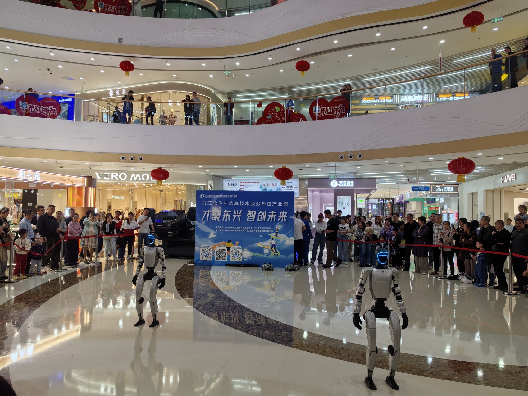 10月20日晚上8点,内江万达广场中庭内热闹非凡,两台人工智能机器人用精彩的舞蹈点燃了围观市民的热情,还有两只机器狗与小朋友握手互动,引得阵阵欢呼。