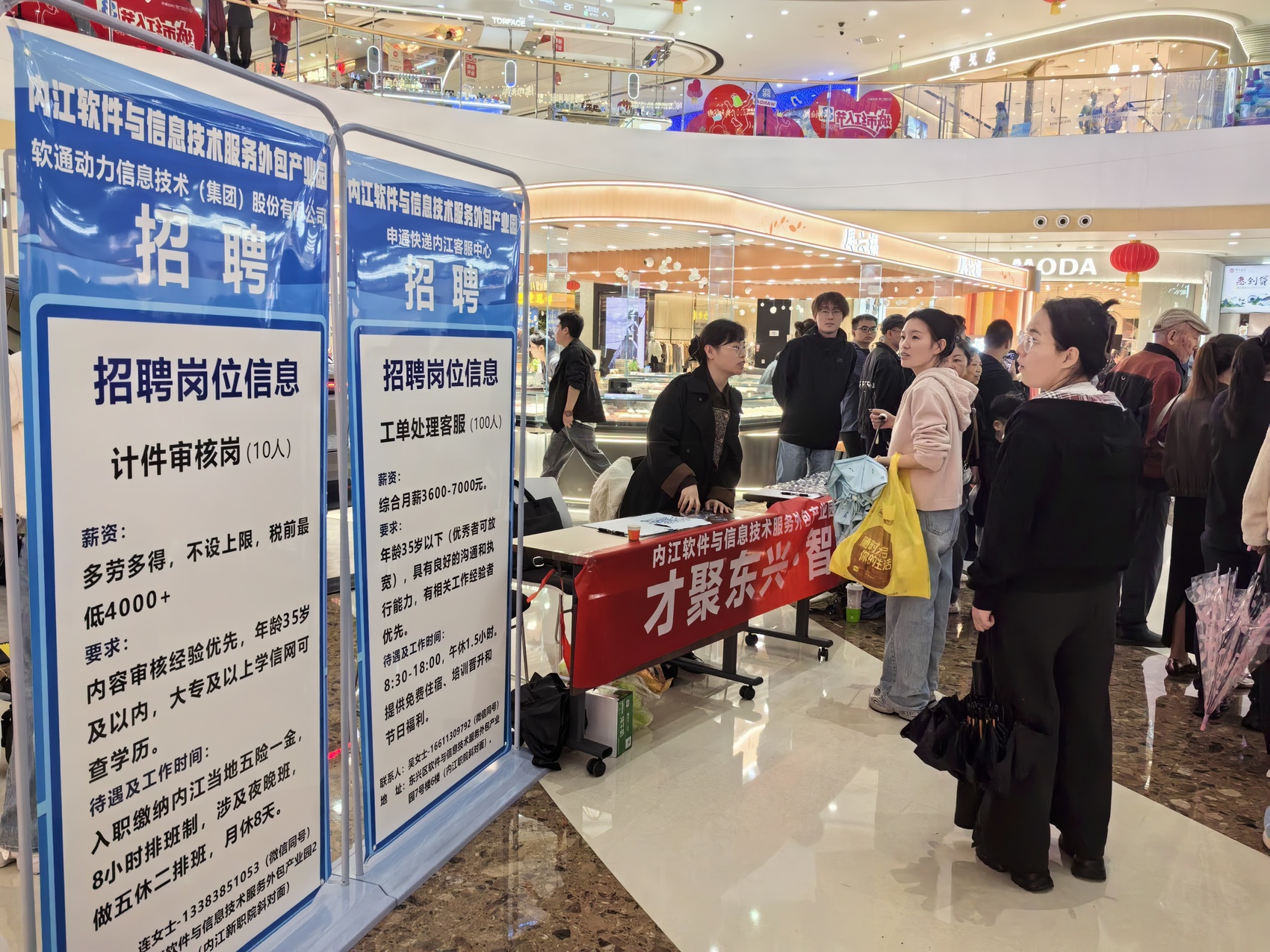 活动现场还包含了招聘环节,内江软件与信息技术服务外包产业园两家入驻企业提供了内容审核、工单处理客服等岗位。市民王女士仔细询问了工资待遇、工作环境、交通、住宿等细节,并留下了联系方式准备进一步对接。“今天听了介绍,对内江服务外包产业有了一些了解。我女儿刚大学毕业不久,学的是计算机专业,她应该对内容审核岗位感兴趣,到时候让她去尝试一下。”王女士表示。