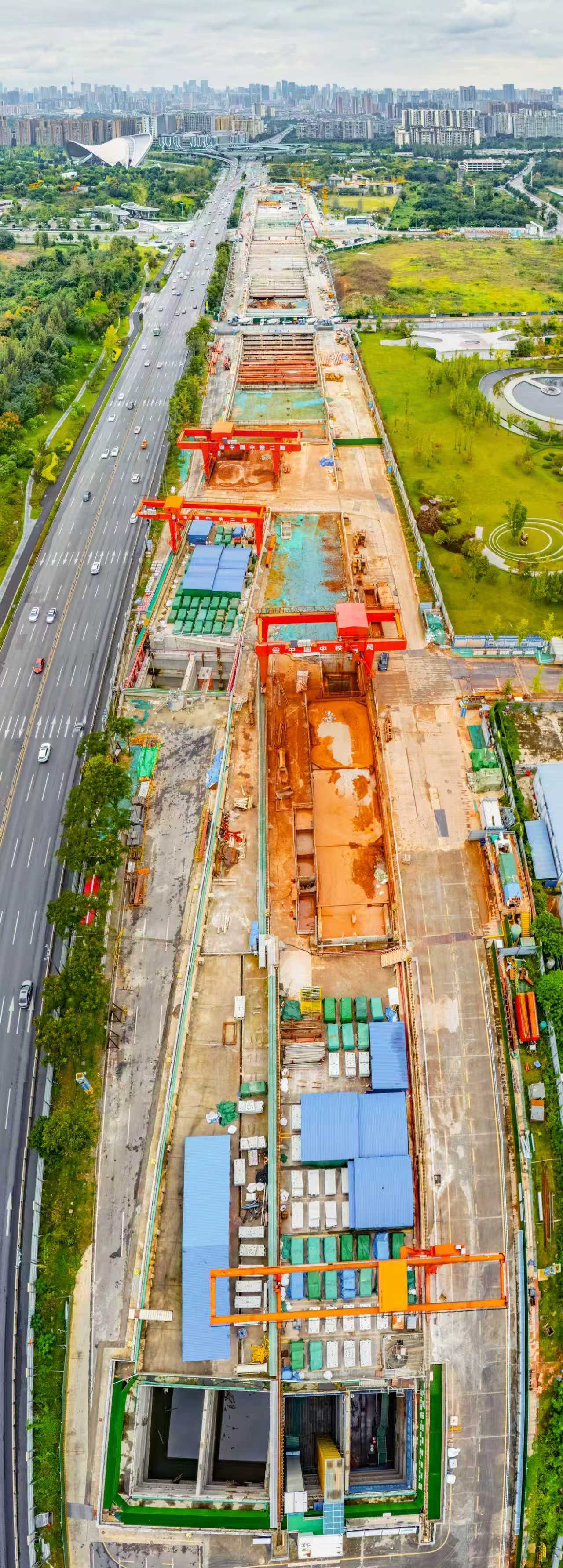 本次实现主体结构封顶的凤凰山站(凤台三路站),位于金牛区北星大道与熊猫大道交叉口,紧邻凤凰山公园与成都露天音乐公园。车站全长988.2米、宽52米、基坑深度达37.3米,是成德线全线最长的车站。成德轨道公司现场负责人陈龙华介绍,车站之所以这么长,是为未来与其他线路便捷换乘提供前置条件。