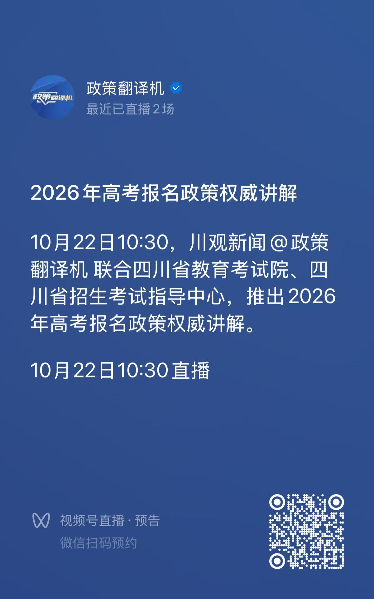 明年有高考学生和家长们看过来。2026年高考政策权威解读明天上午10点半,川观新闻客户端、政策翻译机视频号和微博同龄直播。
