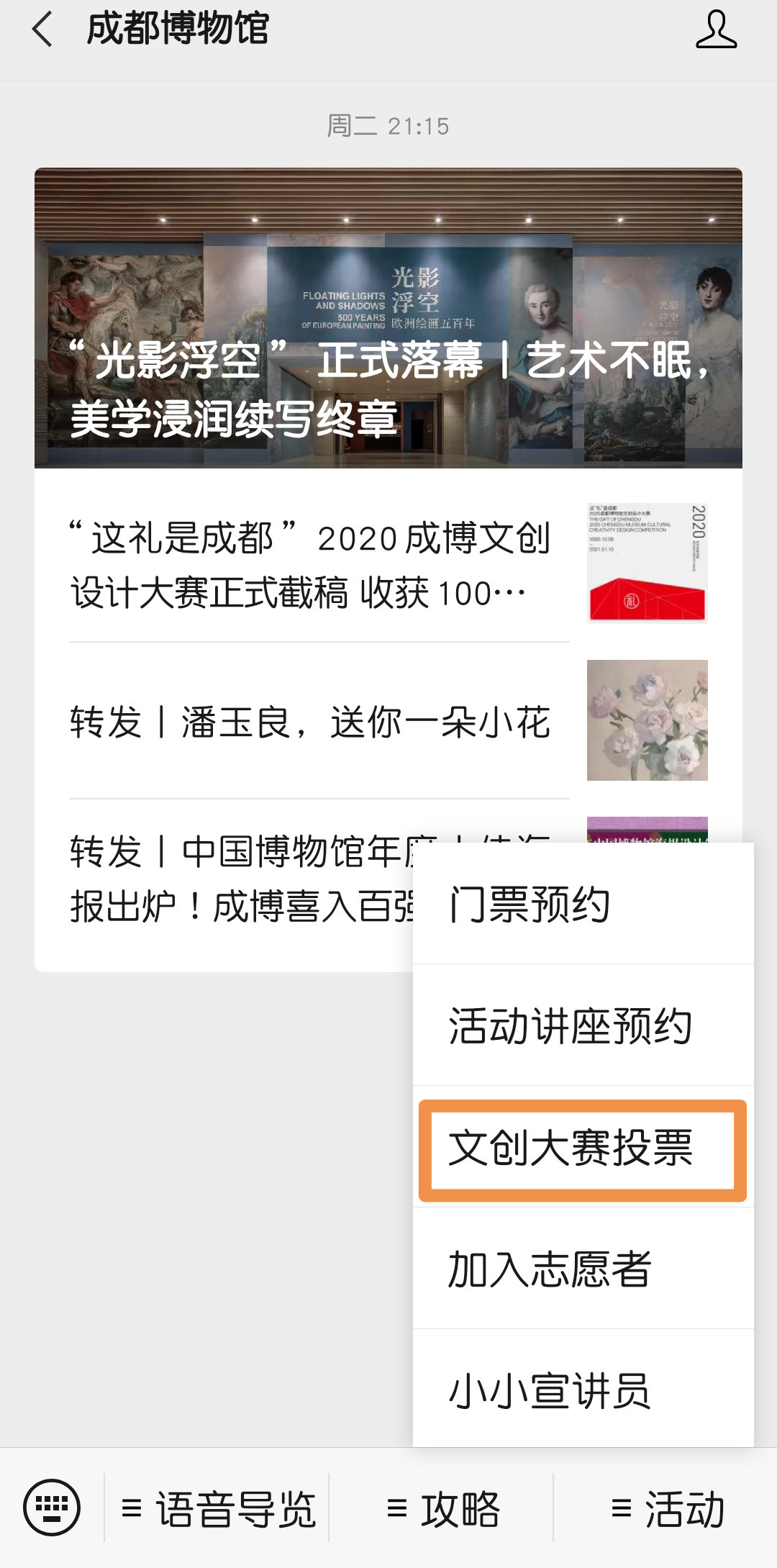 投票方式:点击“成都博物馆”官方公众号主页面下方“活动”-“文创大赛投票”即可参与。投票期间,每个微信账号+手机号每天最多可以投5票,可对多件作品灵活投票。网络投票将在1月23日截止。