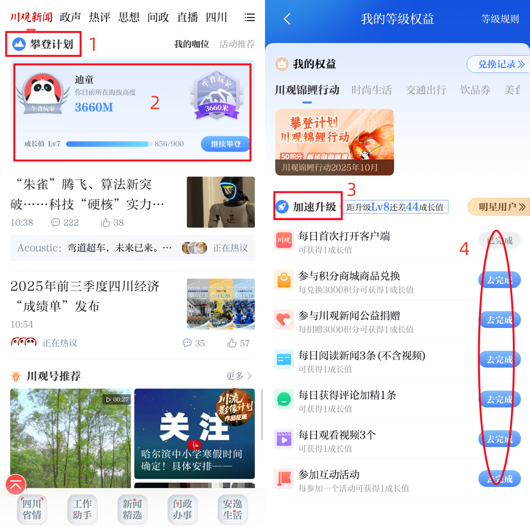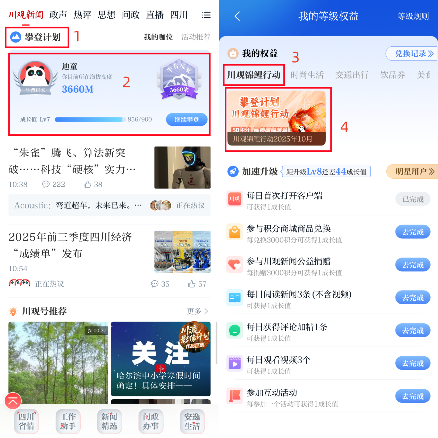 2、在川观新闻首页,点击“攀登计划”—“我的权益”,找到“川观锦鲤行动2025年10月”活动图片,根据提示参与抽奖。