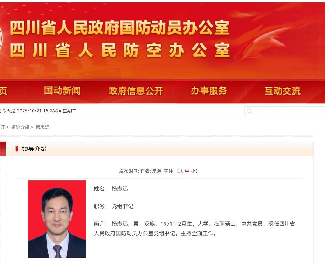 据四川省人民政府国防动员办公室、四川省人民防空办公室网站近日更新消息,杨志远已任四川省人民政府国防动员办公室党组书记。主持全面工作。
