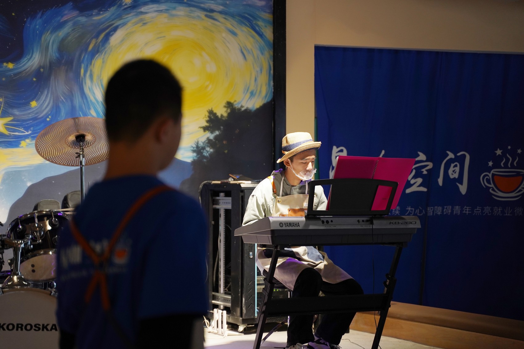 雨停了,逐渐敞亮的天光透过星咖空间的玻璃窗,落在梵高星空图案的桌布上。康复师带着“特需伙伴”们拍摄咖啡馆的推广短视频,大家并排而站,用既不协调也不整齐的动作比划着爱心,一遍遍重复着——