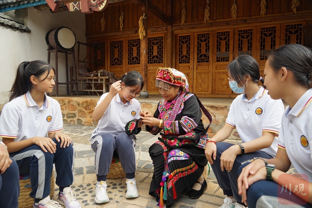 结合中小学生年龄和兴趣特点,该区7所中小学将非遗与延时服务、兴趣社团相结合,开设金沙漆画、剪纸、版画等10余项非遗课程。