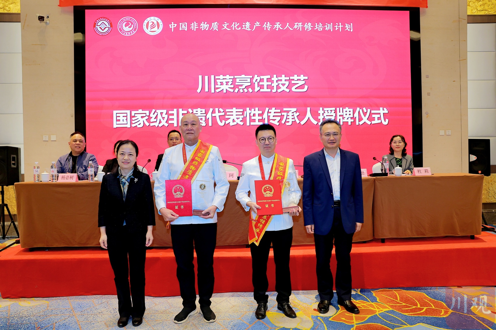 川菜国家级非遗代表性传承人卢朝华、徐孝洪接受授牌。