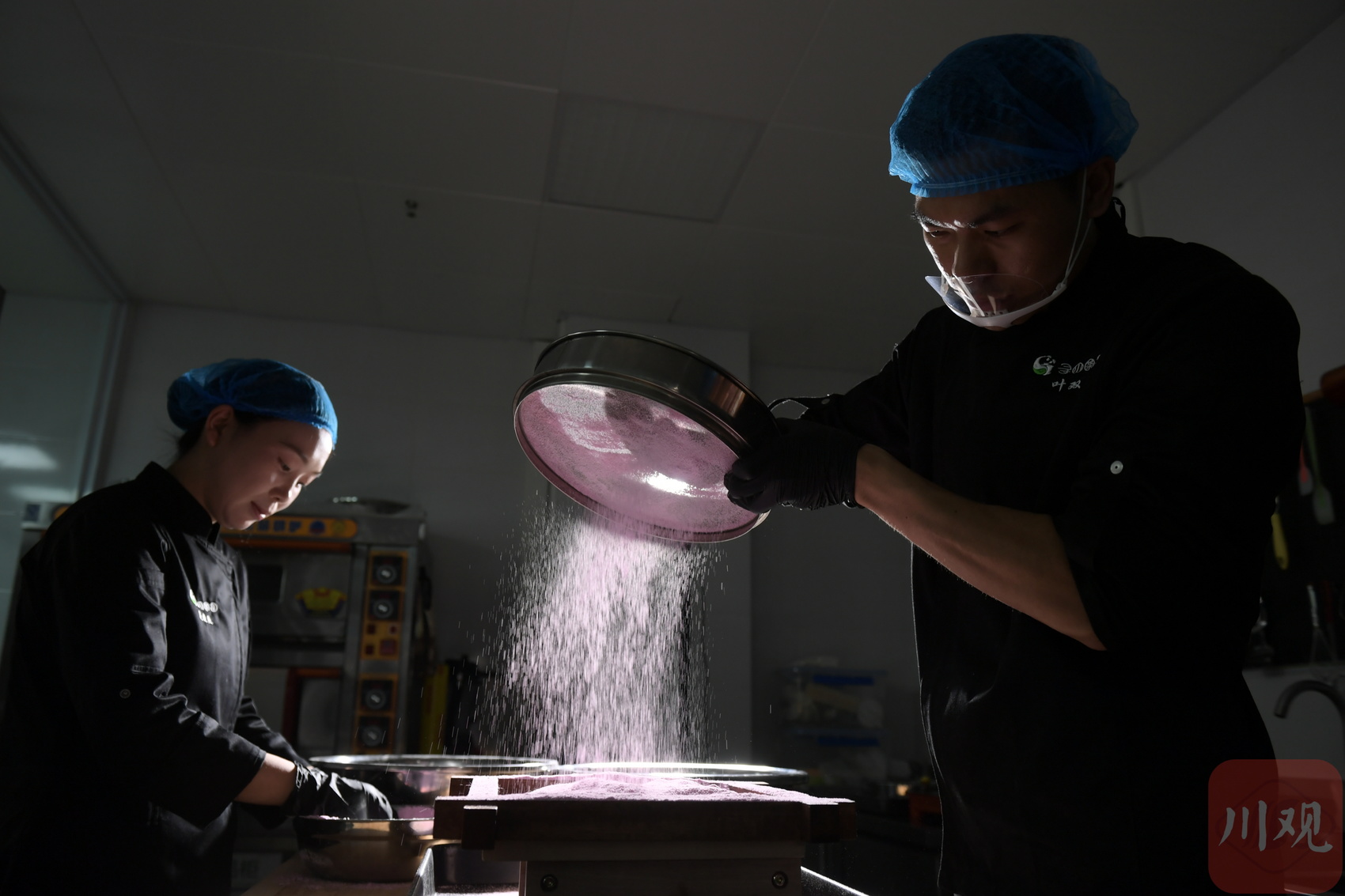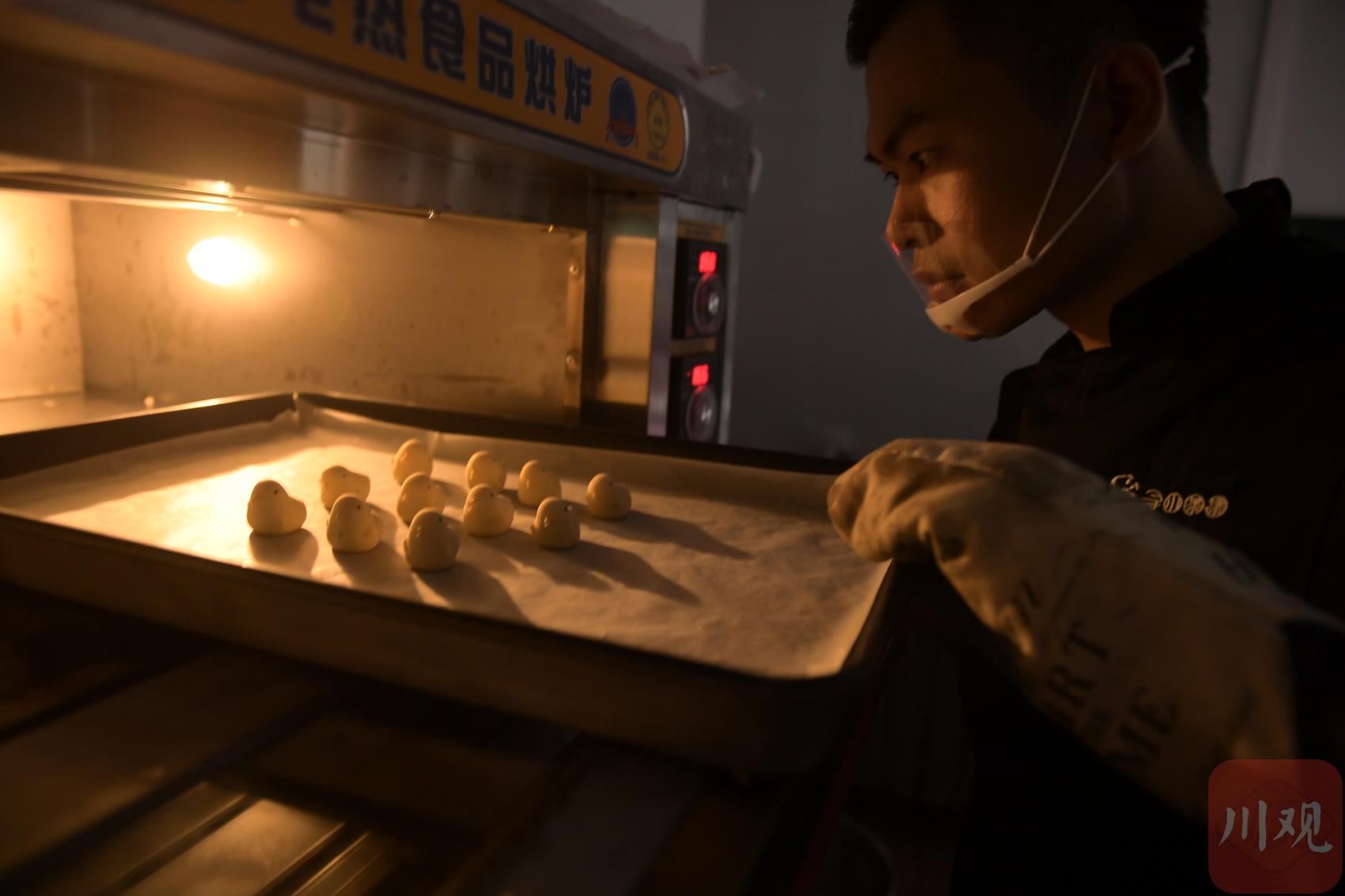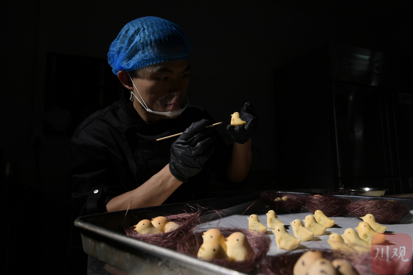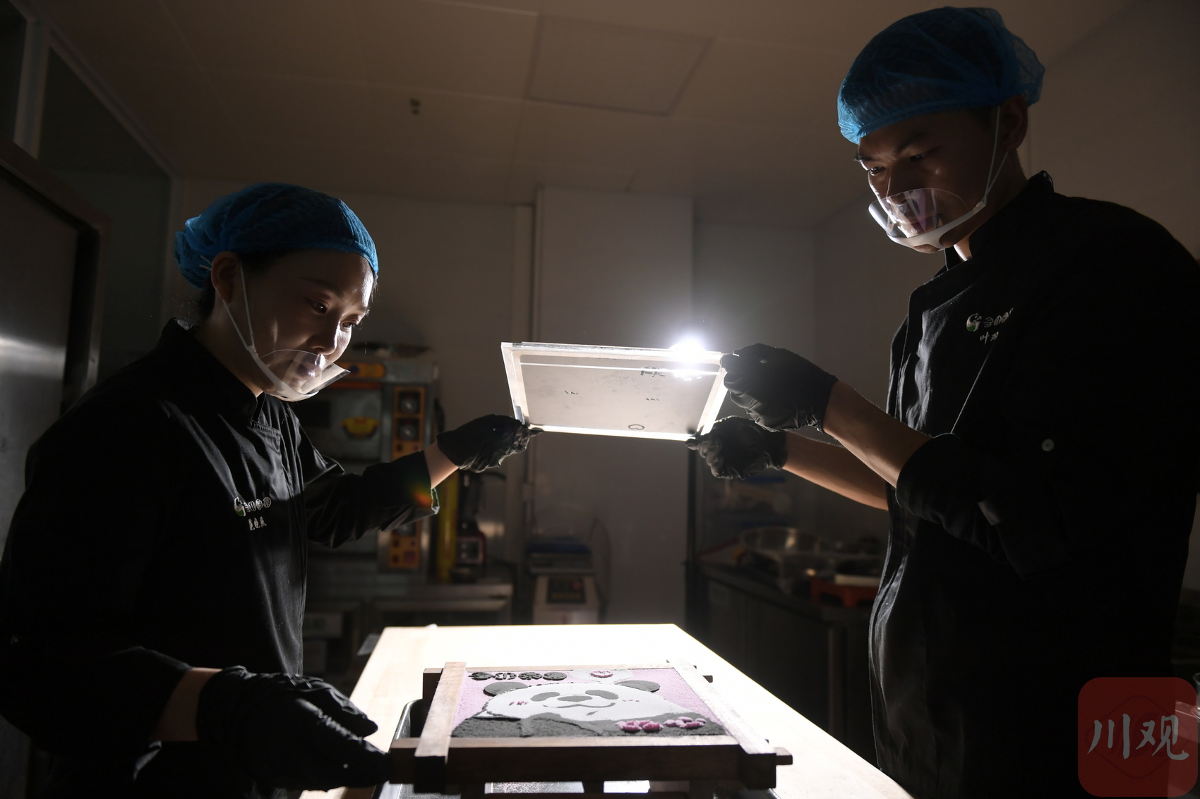 工作人员正在赶制创意糕点天府调色盘熊猫米糕。