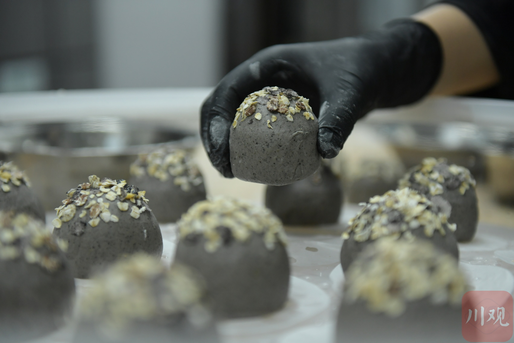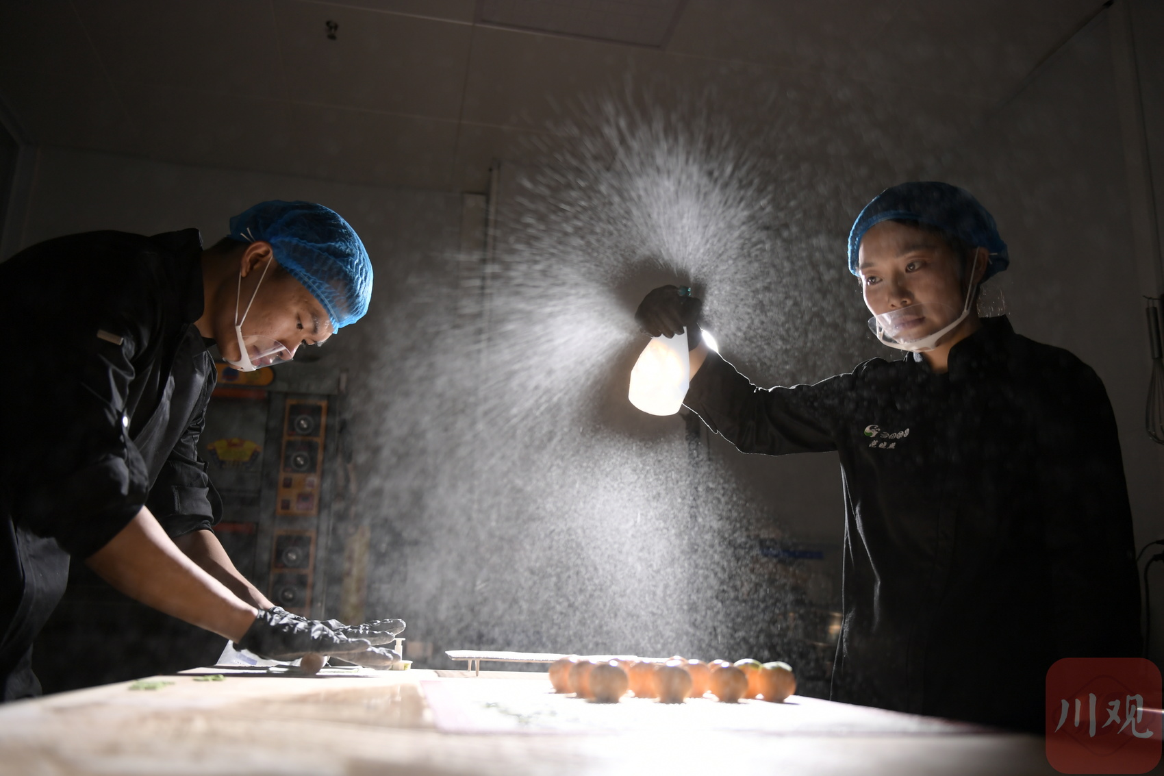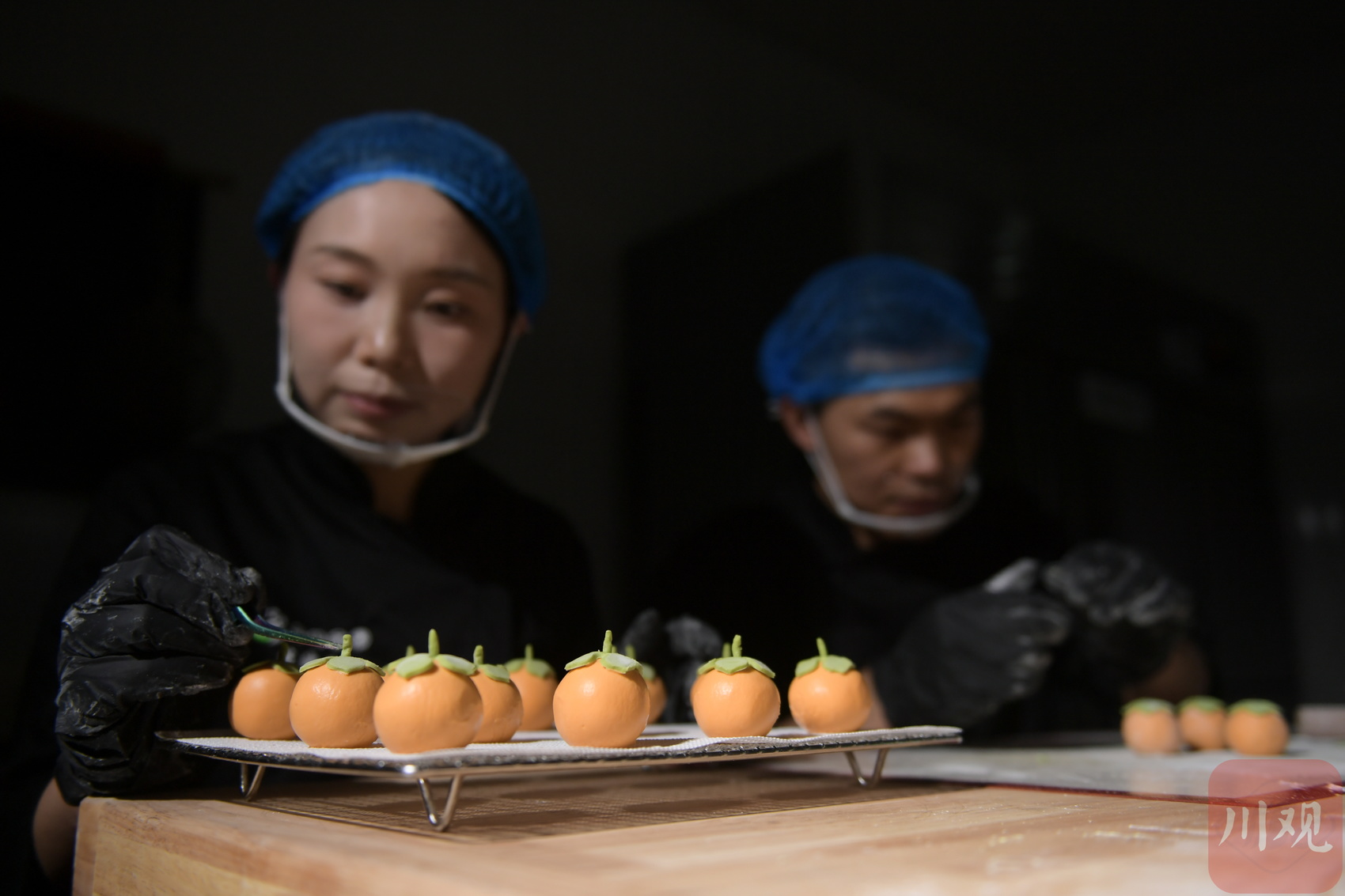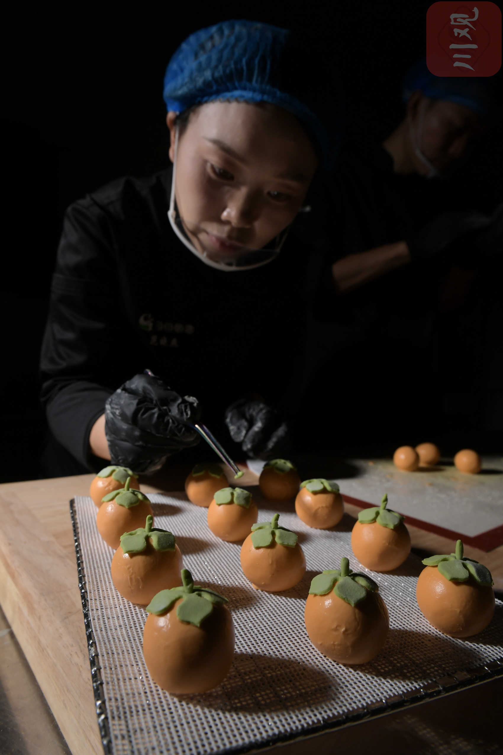 工作人员正在赶制创意糕点天府调色盘熊猫米糕。