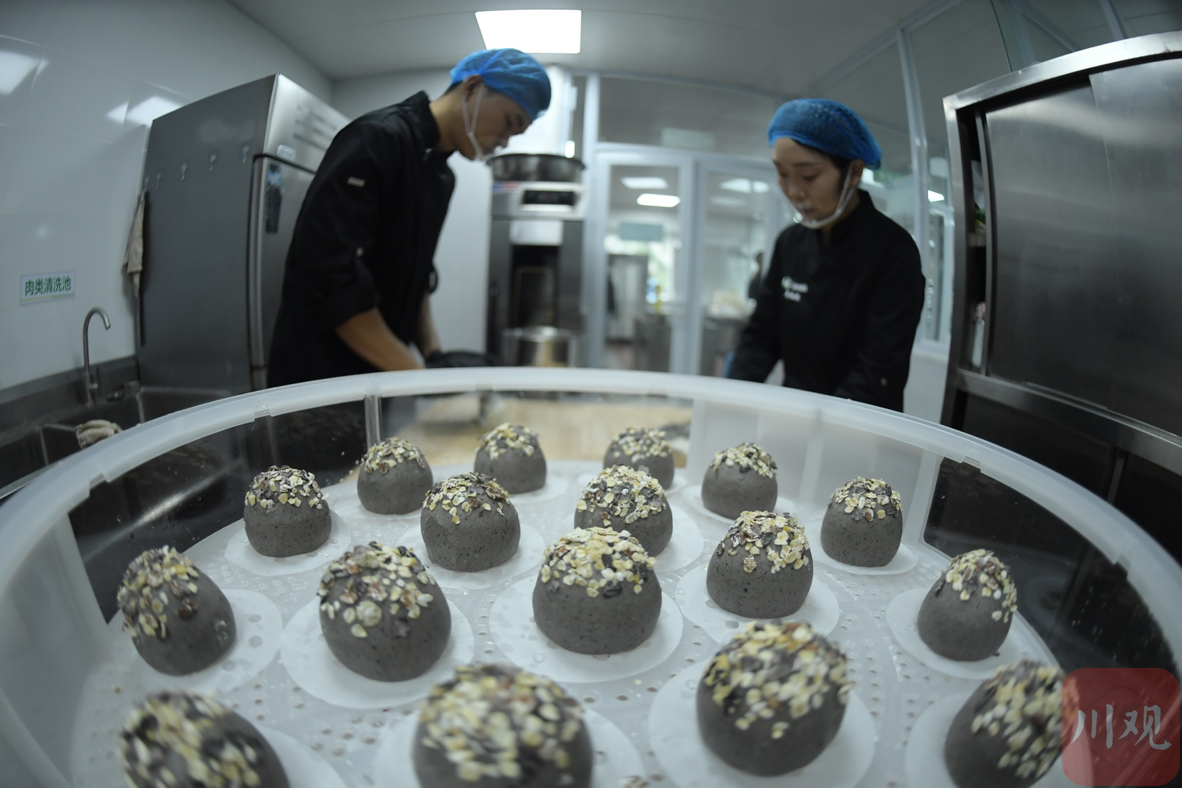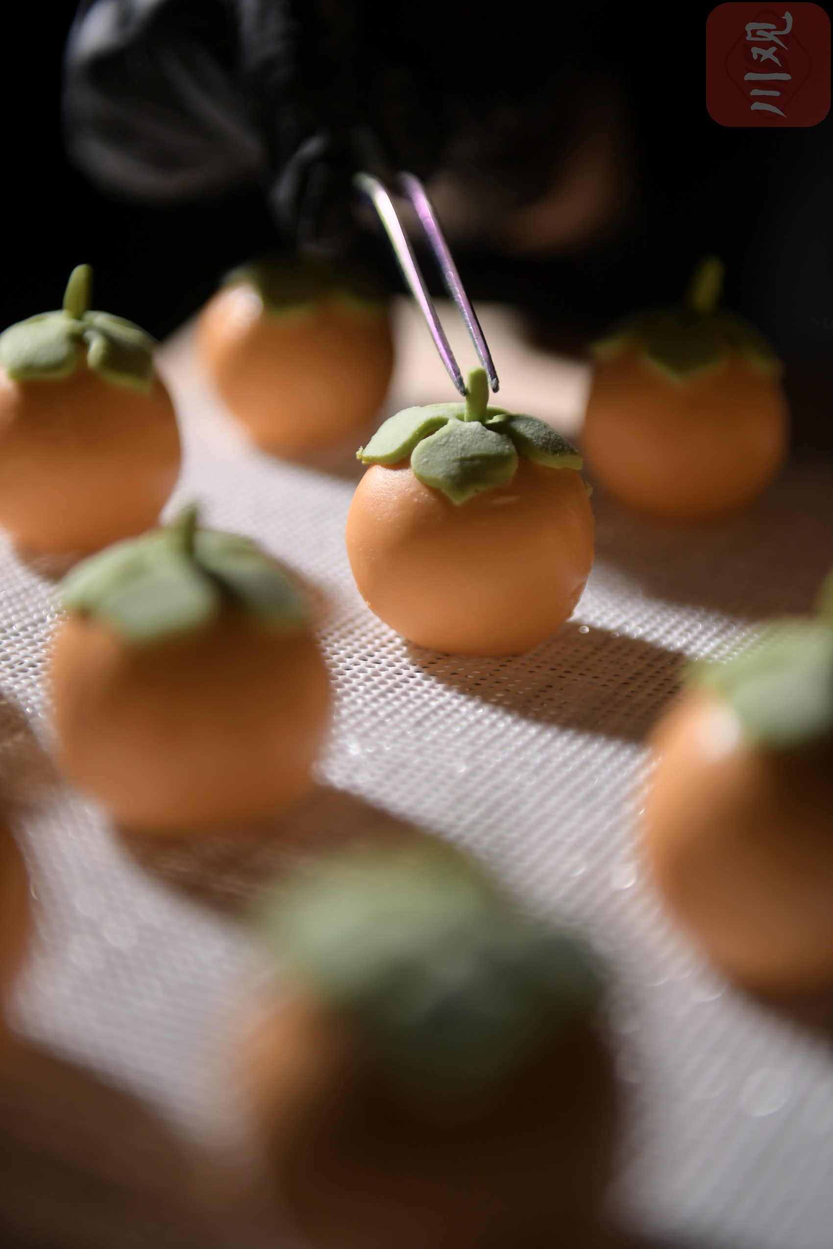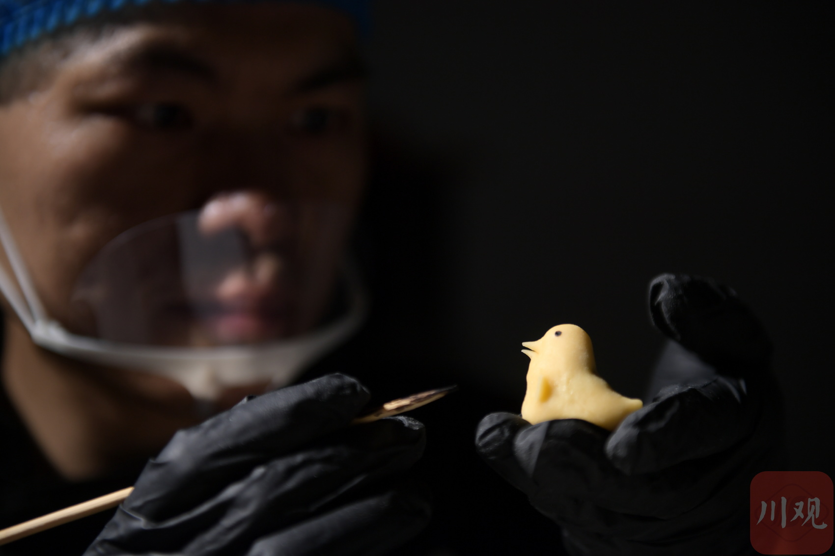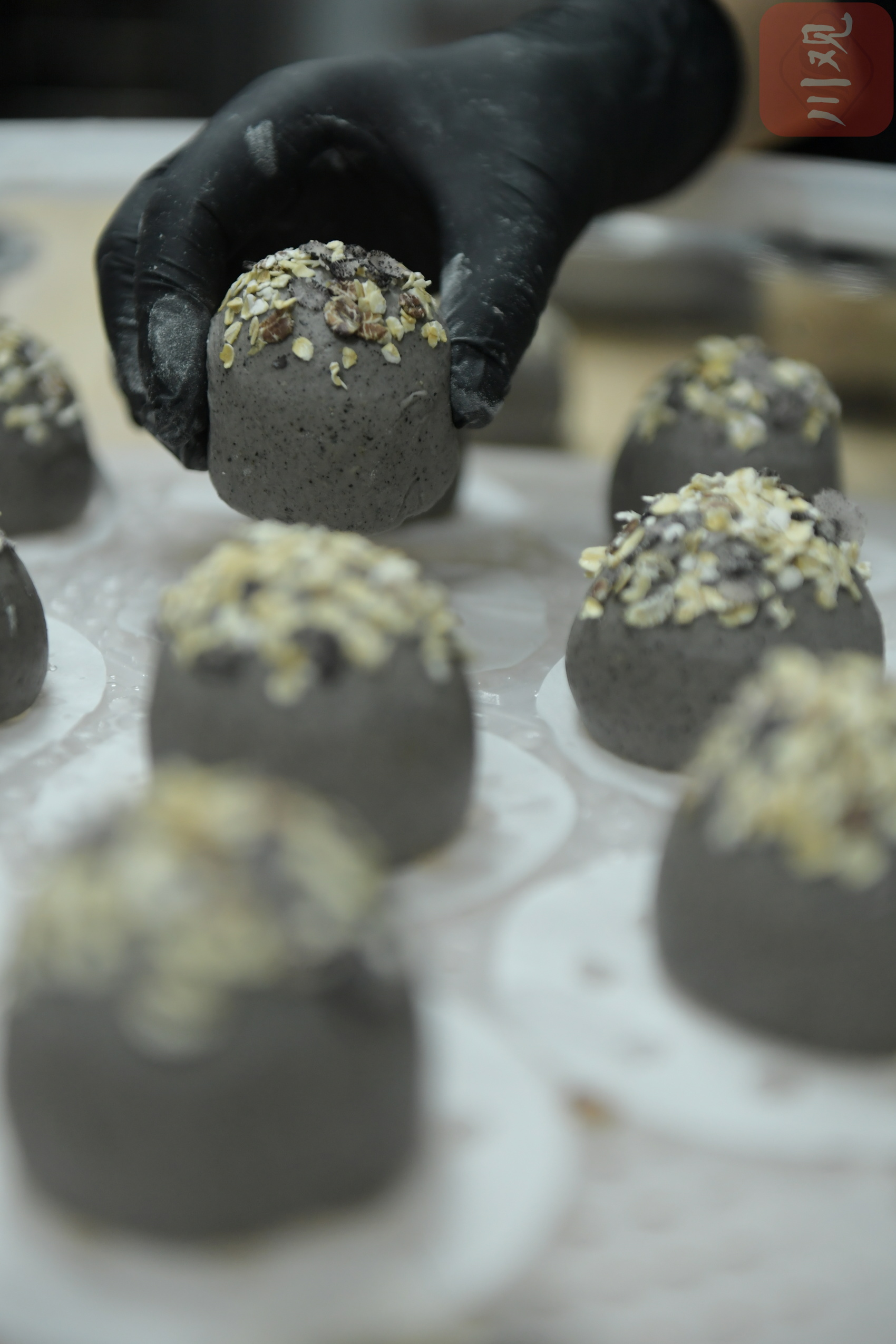 工作人员正在赶制创意糕点天府调色盘熊猫米糕。