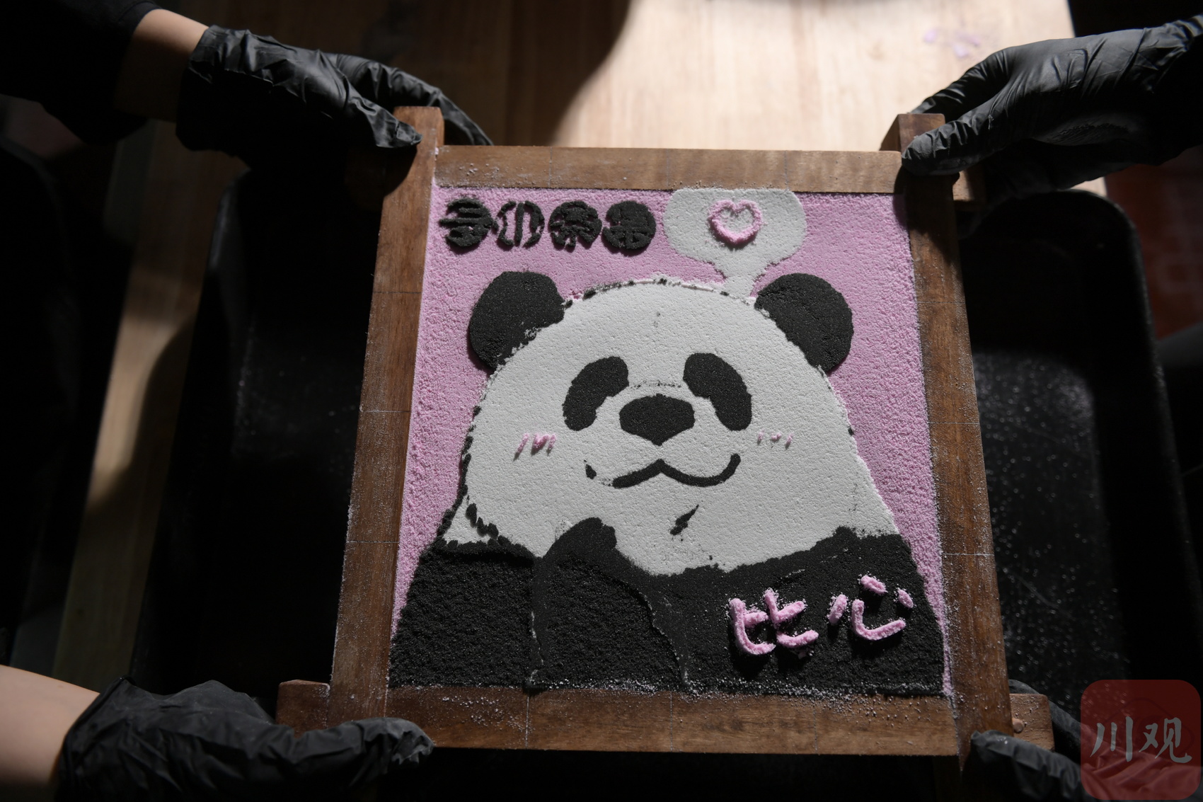 工作人员制作完成的创意糕点天府调色盘熊猫米糕。