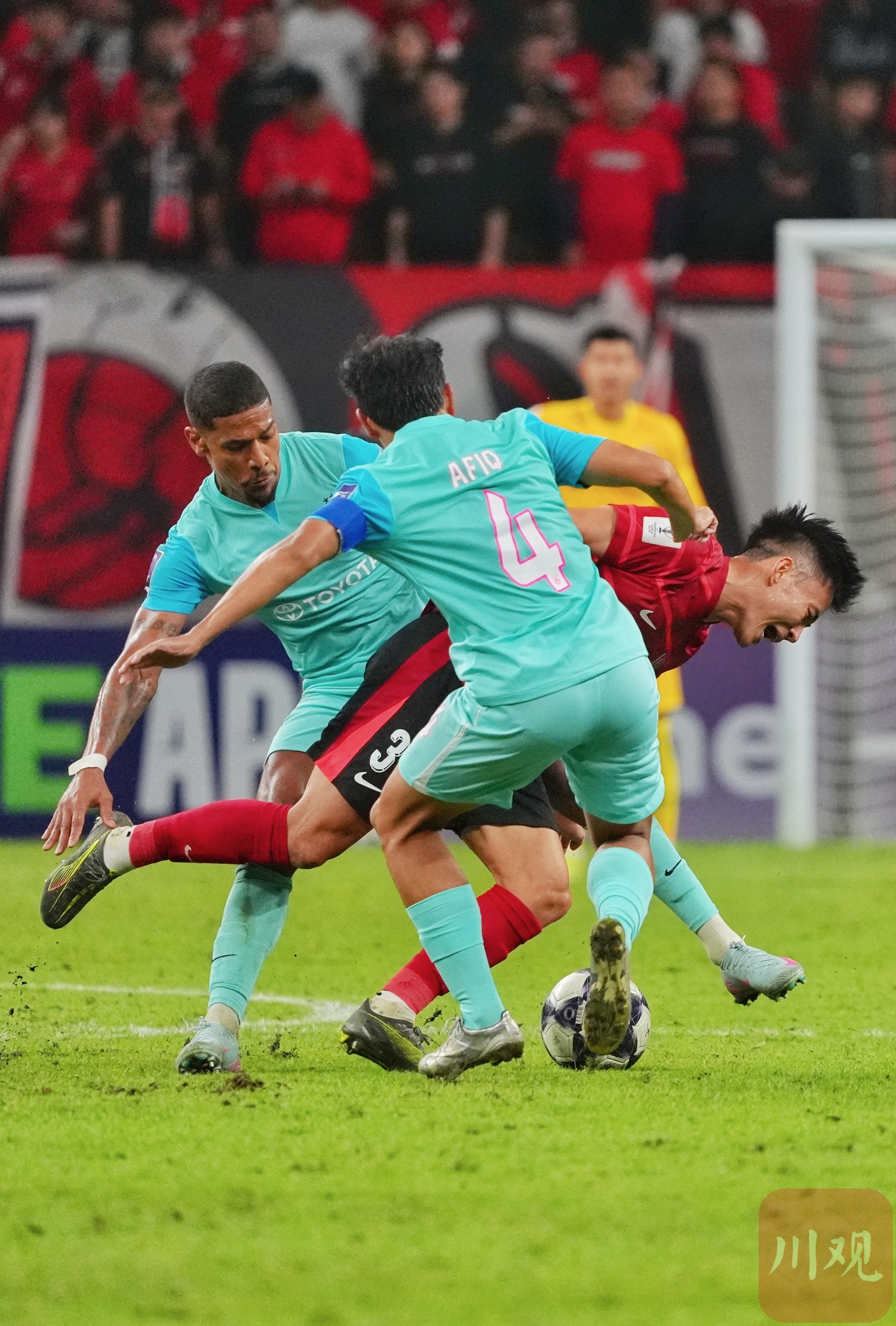 对方两名球员夹击成都蓉城队员(红衣成都蓉城队员)。