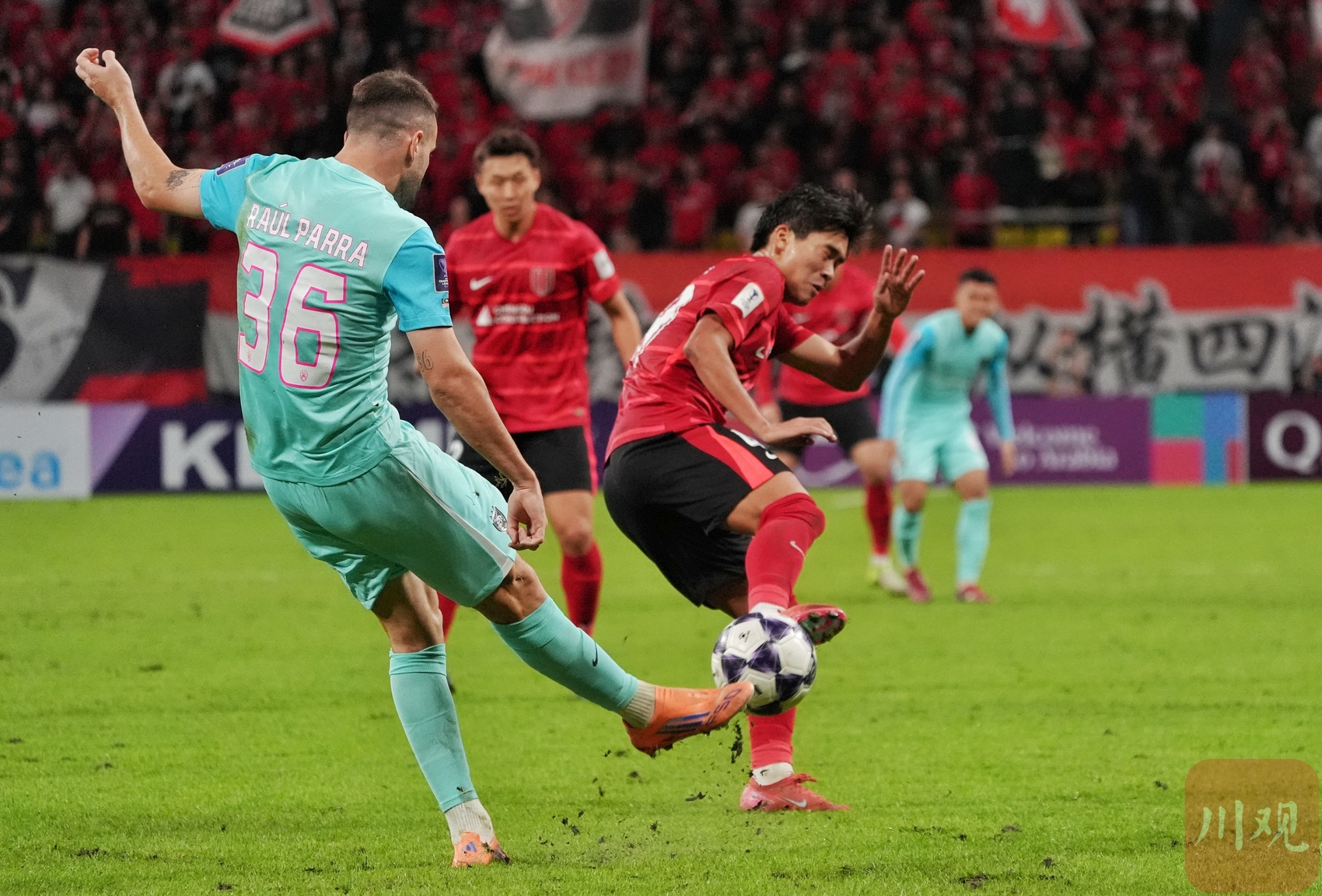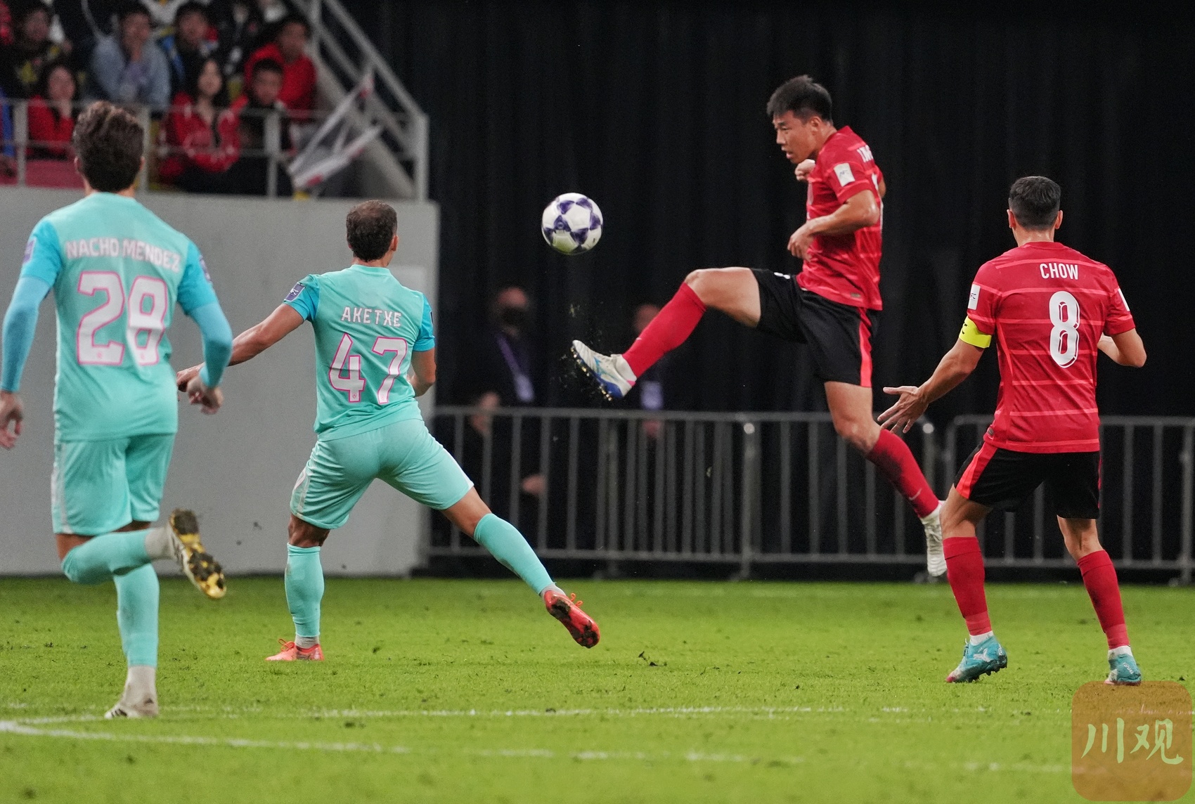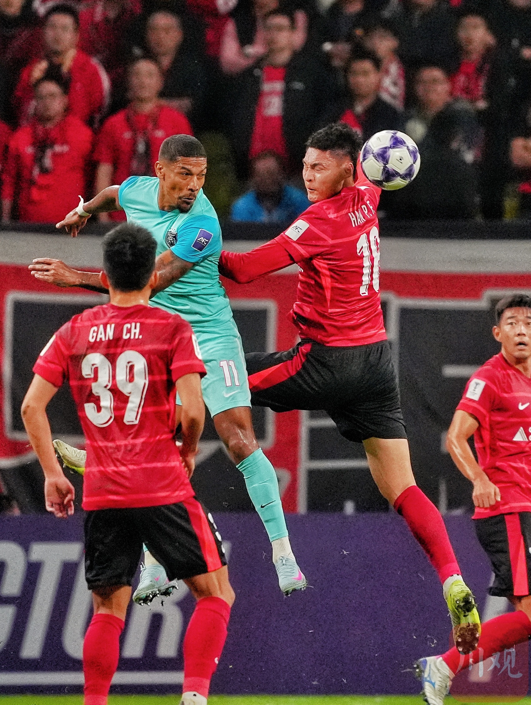成都蓉城队员头球进攻(红衣成都蓉城队员)。