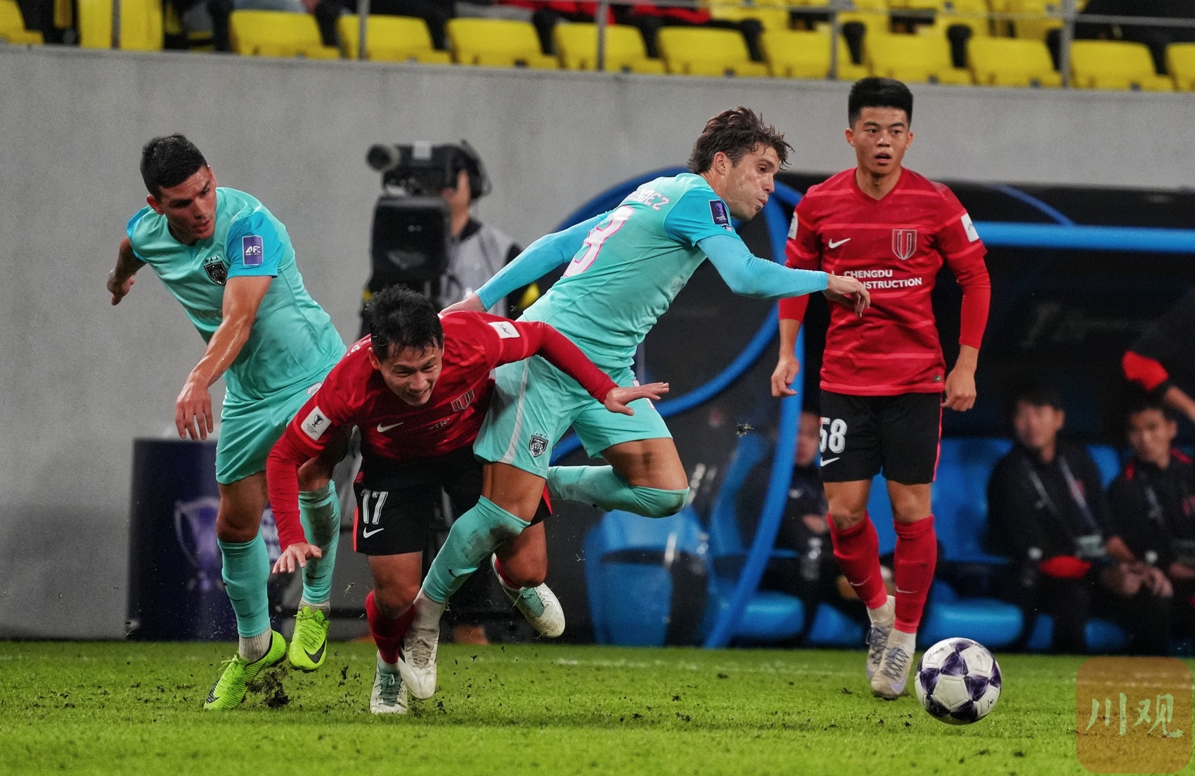 双方在中场争抢头球。(红衣成都蓉城队员)。