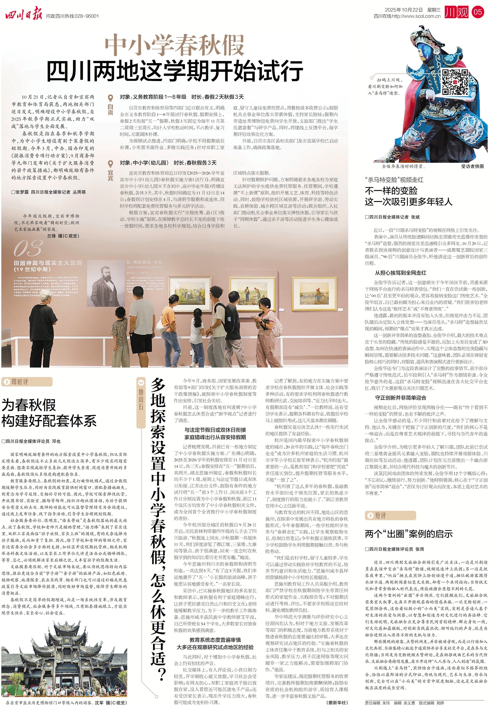近日,自贡、宜宾两地相关部门发文,明确增设中小学春秋假,自2025年秋季学期正式实施。其中自贡明确,春假2天衔接“五一”假期,秋假3天固定为每年11月第二周周三至周五。宜宾将秋假时间确定为11月12日至14日;春假则计划安排在4月,与清明节假期形成连休。 不少成都网友关心,成都市中小学春秋假何时来?关注今日五版,看成都官方的回复。