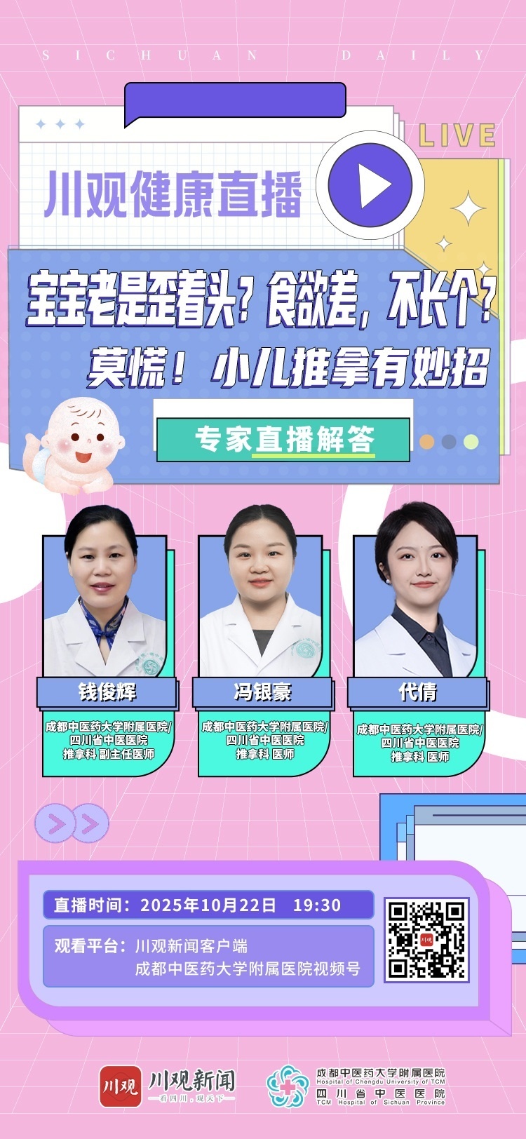 10月22日是世界传统医药日,川观新闻携手成都中医药大学附属医院/四川省中医医院开展健康主题直播,聚焦备受关注的小儿推拿,邀请三位专家为家长们科普答疑,助力儿童健康成长。