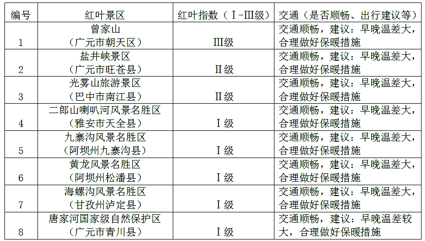 未来一周较适宜观赏红叶的景点,主要分布在我省东北部曾家山、盐井河峡谷、光雾山景区。此外,今年受闰月和气候等因素影响,红叶观赏期较往年预计推迟10~15天。省林草旅游中心提醒,红叶宜晴朗天气观赏,大部分景区温差较大,需做好保暖措施,山路曲折,注意出行安全。
