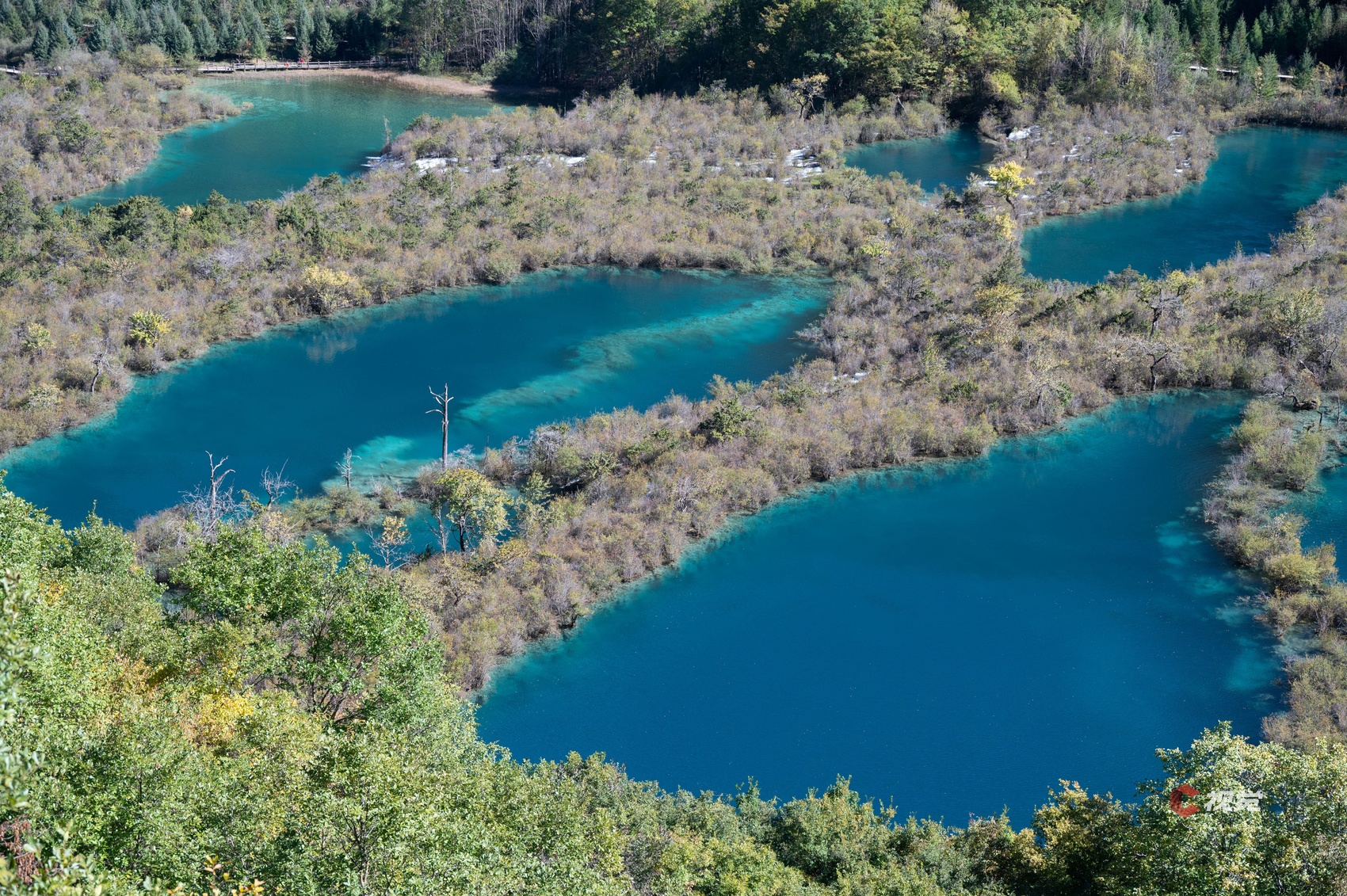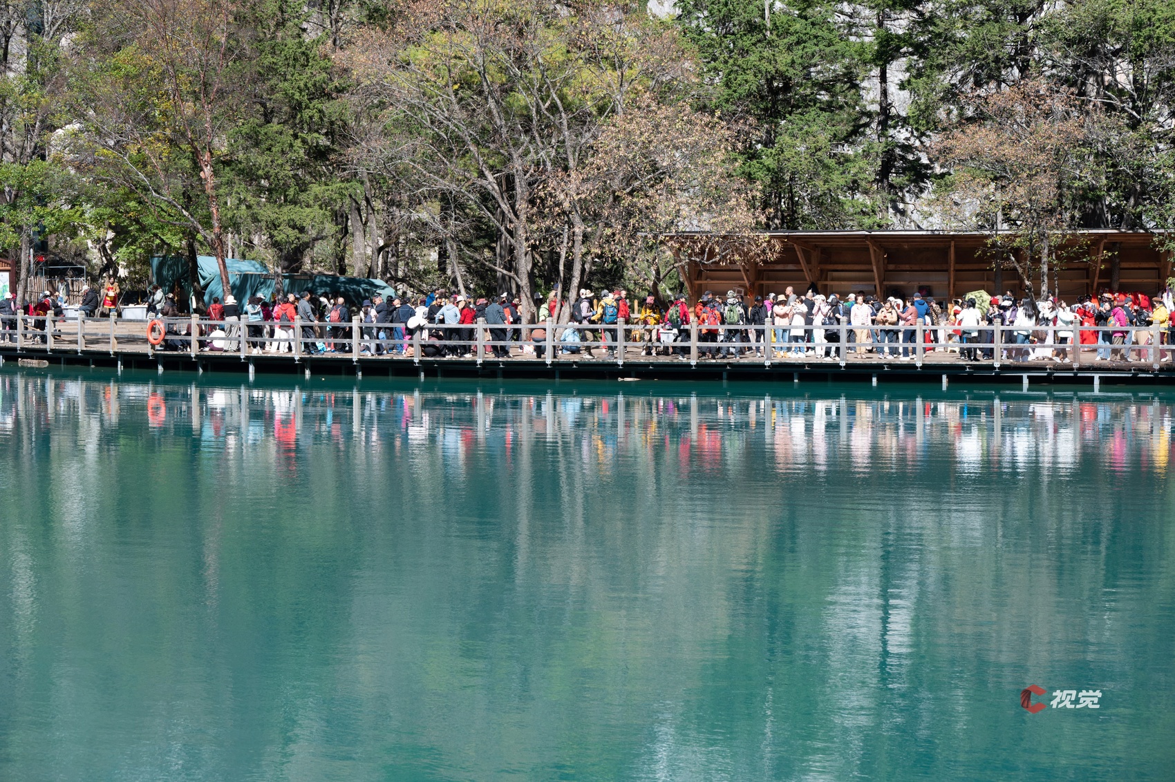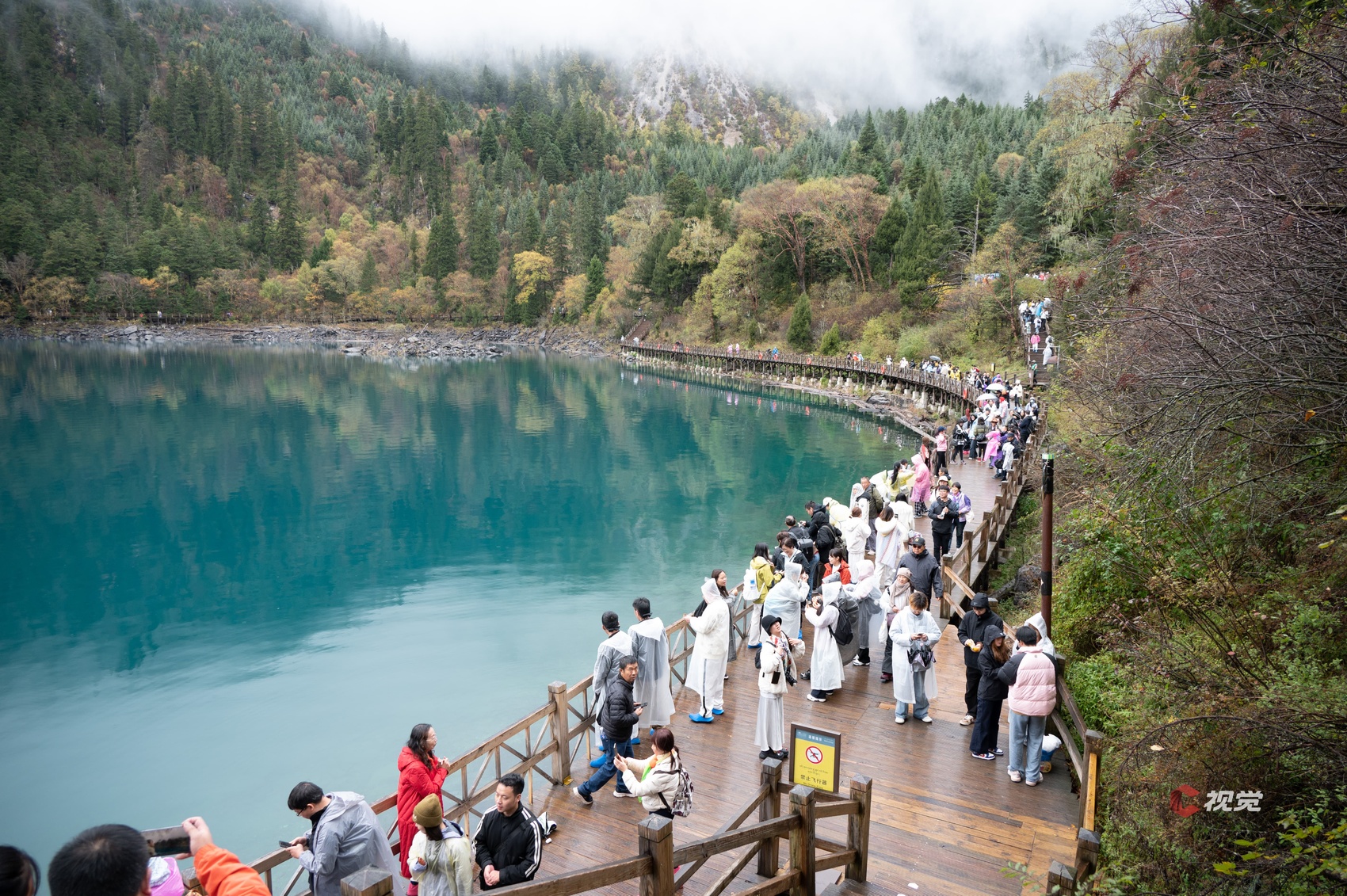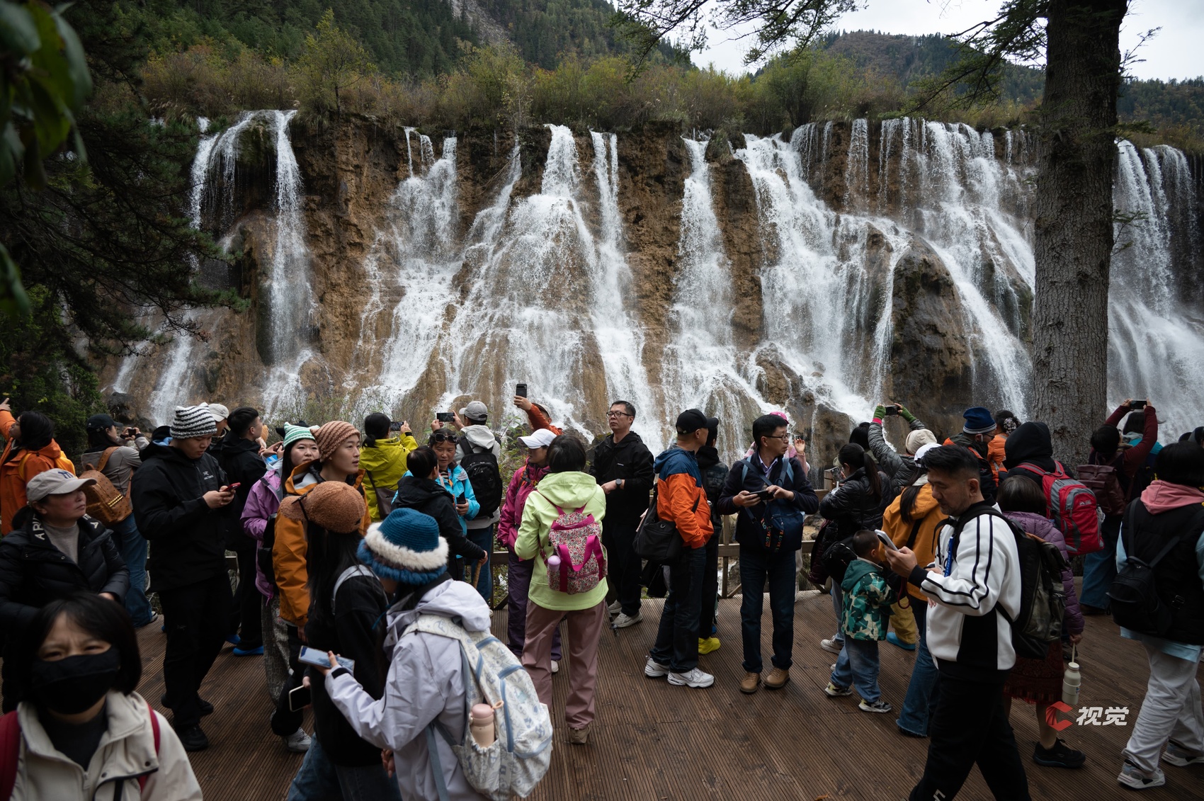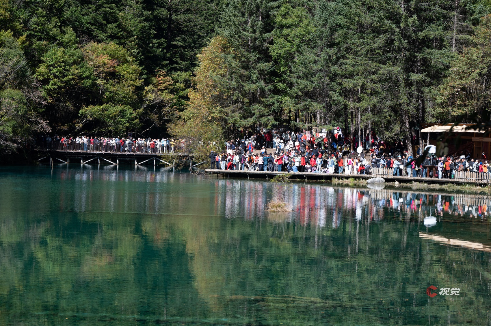 10月21日,“秋色封神”的九寨沟,游客挤满了景区栈道。