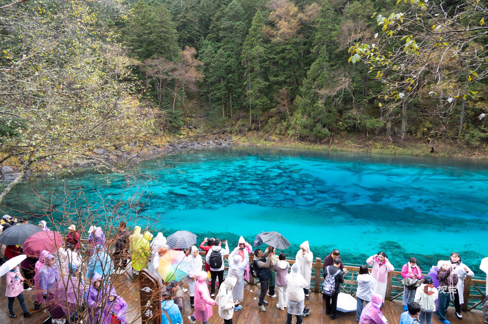 10月20日,尽管小雨淅沥,但仍未影响游客们游览九寨沟的热情。