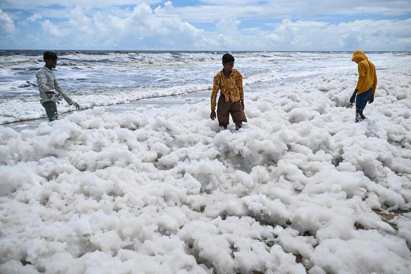 10月22日,在印度金奈的一处海滩,人们站在白色泡沫中。